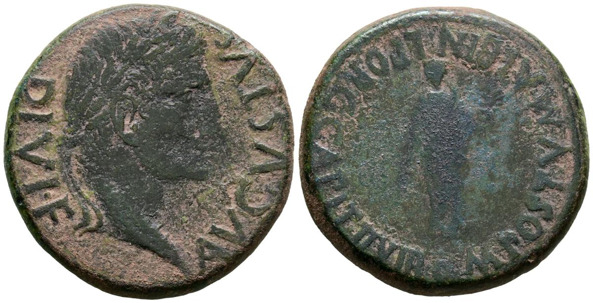 CARTAGONOVA (Cartagena, Murcia). As. (Ae. 16.76g/28mm). 27 BC-14 AD (FAB-576). Anv: Laureate head of Augustus to the right, around legend: DIVI F AVGVSTVS. Rev: Priest in front, around legend: M POSTVM ALBIN L PORC CAPIT II VIR. Almost Very Fine.
