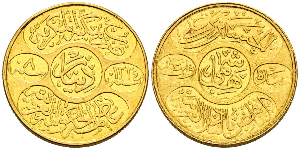SAUDI ARABIA. Dinar. (Au. 7.19g/22mm). 1334H (1924). Makka (Mecca). Km#31; Friedberg 1). Good Very Fine.