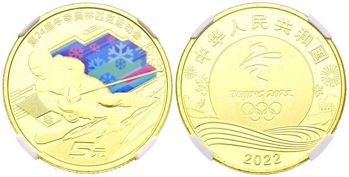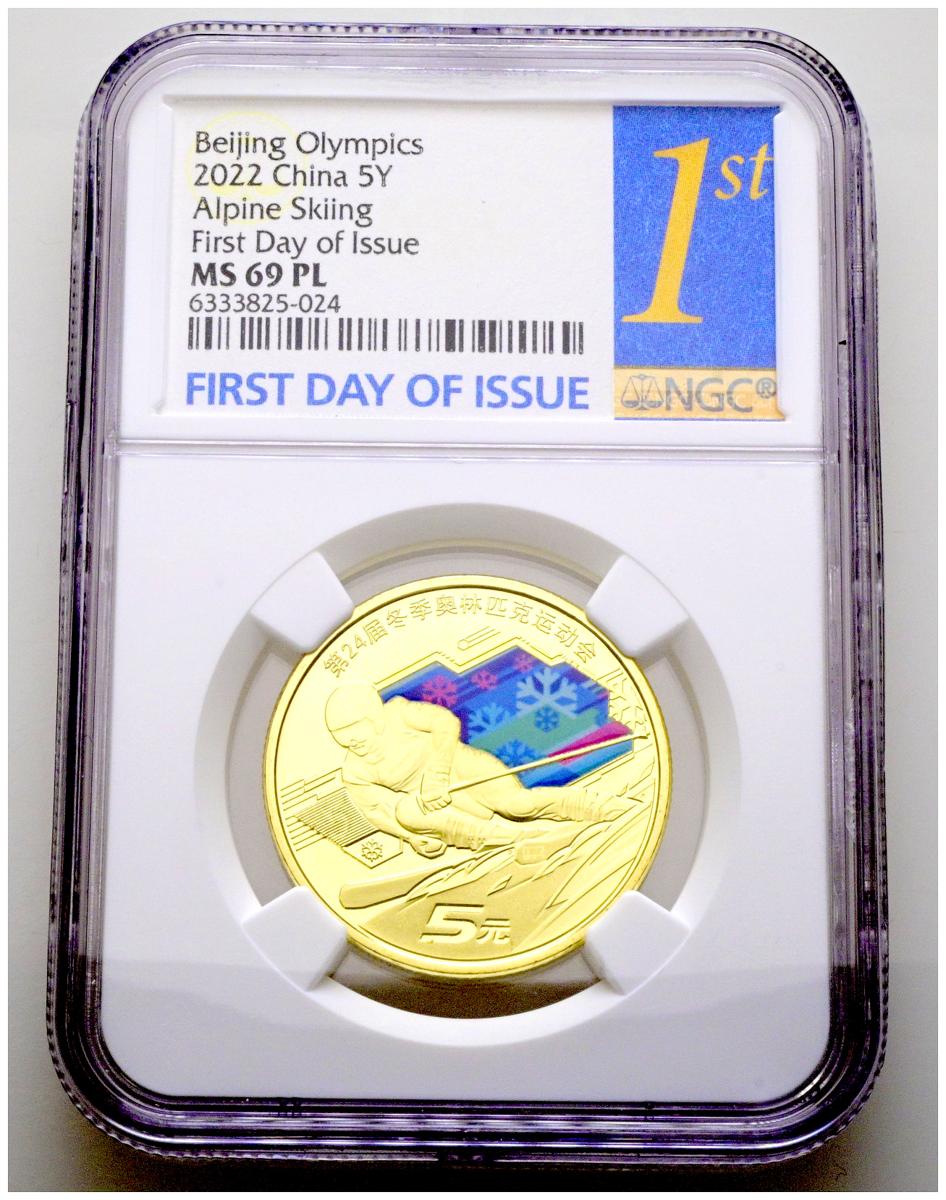 CHINA. 5 Yuan. (Golden bronze. 13.00g/30mm). 2022. Winter Olympic Games, "Alpine Skiing". Encapsulated by NGC MS-69PL.