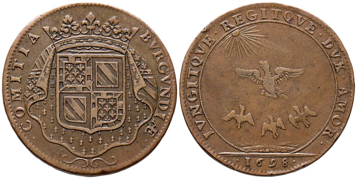 FRANCE, Louis XIV. Jetón commemorating the Peace of Riswick. (Ae. 8.33g/31mm). 1698. (F. 9825). Anv: Escudo of Burgundy, around legend: COMITIA BVRGNDIAE. Rev: Eagle with its three young flying towards the sun, below: 1698, around legend: IVNIGTQVE REGITQVE DVX AMOR. Good Very Fine.