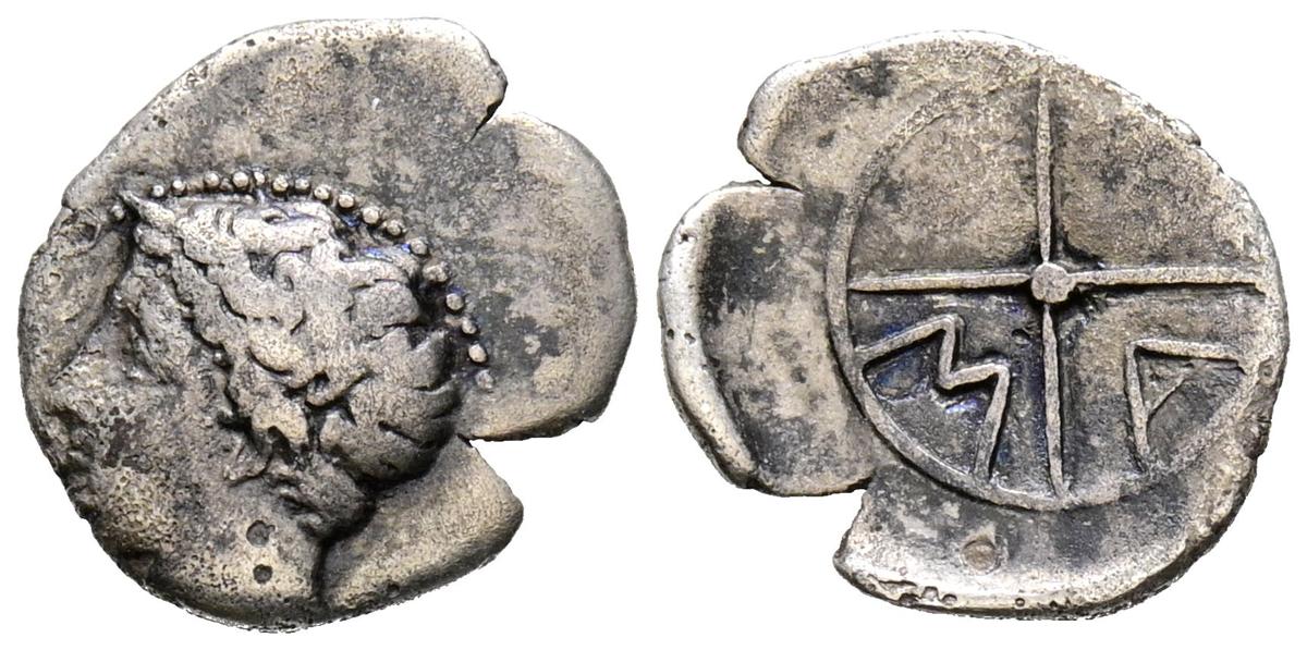 GALIA, Massalia. Trietartemorion. (Ar. 0.56g/12mm). 200-110 BC (FAB-1181). Anv: Male head to the left. Rev: Four-wheeled wheel, in the 3rd and 4th quadrant letters: MA. Very Fine.
