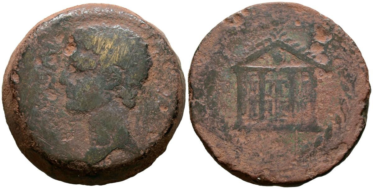 GADES (Cádiz). Dupondius. (Ae. 34.72g/36mm). 27 BC-14 AD (FAB-1385). Anv: Head of Augustus to the left, in front legend: AVGVSTVS. Rev: Tetrastyle temple inside a laurel wreath. Fine Scarce copy.
