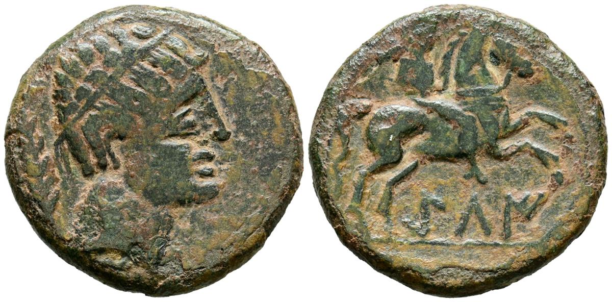 GILI (Gilet, Valencia). As. (Ae. 8.96g/25mm). 120-20 BC (FAB-1388). Anv: Male head with diadem on the right, spike behind. Rev: Rider with palm on the right, below online Iberian legend: GiLI. Very Fine.