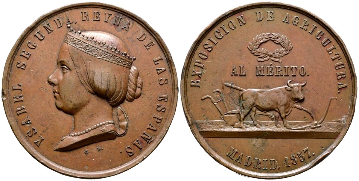 ELIZABETH II (1833-1868). Agriculture Exhibition. Merit Award (Ae. 114.65g/59mm). 1857. Madrid. Engraver: Louis Charles Bouvet (CB). In song: Cuivre. (V.401). Good Very Fine.