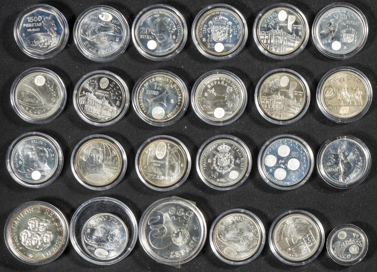 English Set of 34 contemporary silver coins of Juan Carlos I and Felipe VI, one of them presented in an official case with certificate. TO EXAMINE.