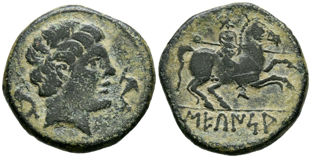 SECAISA (Segeda, Zaragoza). As. (Ae. 7.74g/24mm). 120-20 BC (FAB-2131). Anv: Male head to the right, between two dolphins. Rev: Rider with lance to the right, below Iberian legend: SECaISA. Almost Very Fine/ Very Fine.
