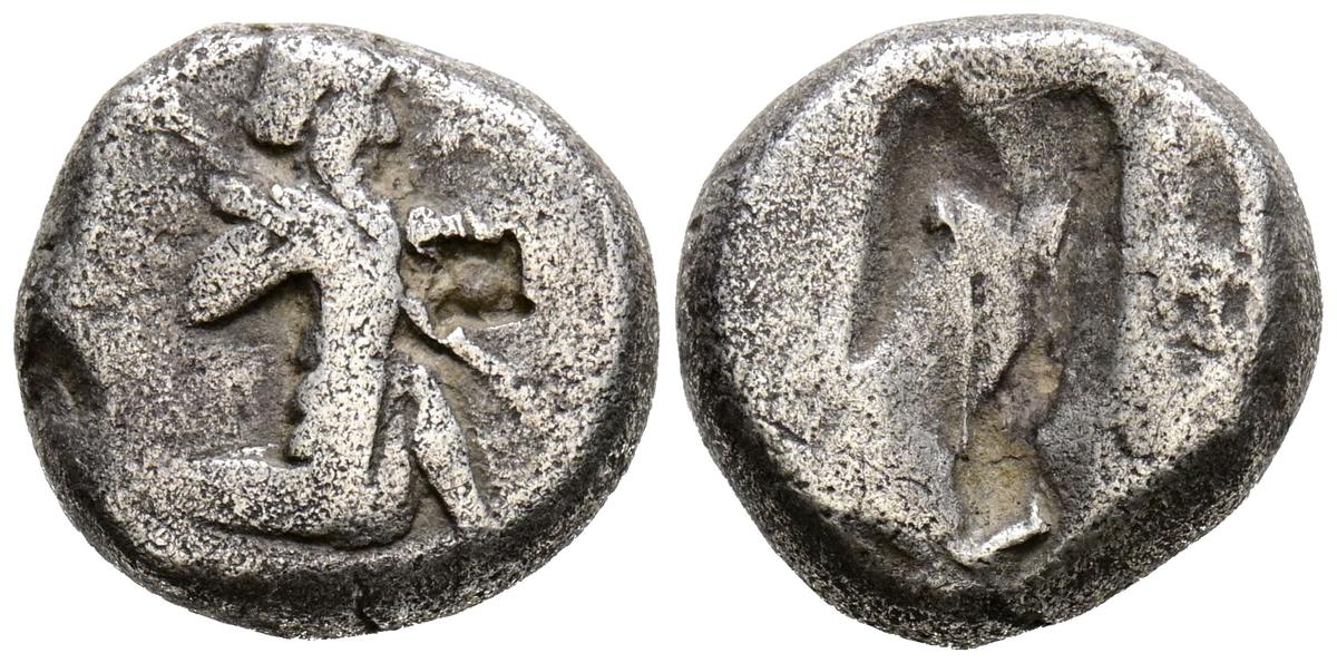 ACHAEMENID EMPIRE, Time from Xerxes I to Darios II. Centuries. (Ar. 5.31g/15mm). 485-420 BC Sardis. (Sunrise 25). Anv: Persian king kneeling on the right carrying bow and spear and quiver on his back. Rev: Square incusus. Almost Very Fine.