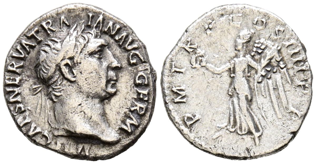 English TRAJAN. Denarius. (Ar. 2.59g/18mm). 102 AD Rome. (IQR 60). Anv: Laureate head of Trajan to the right, around legend: IMP CAES NERVA TRAIAN AVG GERM. Rev: Victoria advancing to the left carrying a laurel wreath and palm, around legend: PM TR P COS IIII P P. Almost Very Fine.