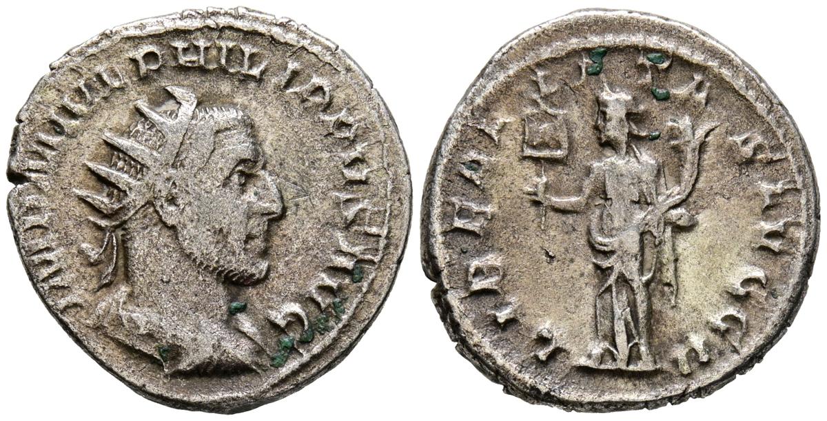 PHILIPPI I. Antoninianus. (Ar. 4.95g/22mm). 244-247 AD Rome. (RIC 38b). Anv: Radiated and draped bust of Philip I to right, around legend: IMP M IVL PHILIPPVS AVG. Rev: Liberalitas standing on the left carrying abacus and cornucopia, around legend: LIBERALITAS AVGG II. Almost Very Fine.