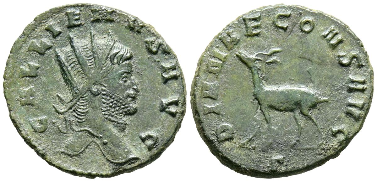 GALLIENUS. Antoninian. (Ae. 3.35g/20mm). 267-268 AD Rome. (RIC 181). Anv: Radiated head of Gallienus to the right, around legend: GALLIENVS AVG. Rev: Deer left, above legend: DIANAE CONS AVG, below r. Good Very Fine.
