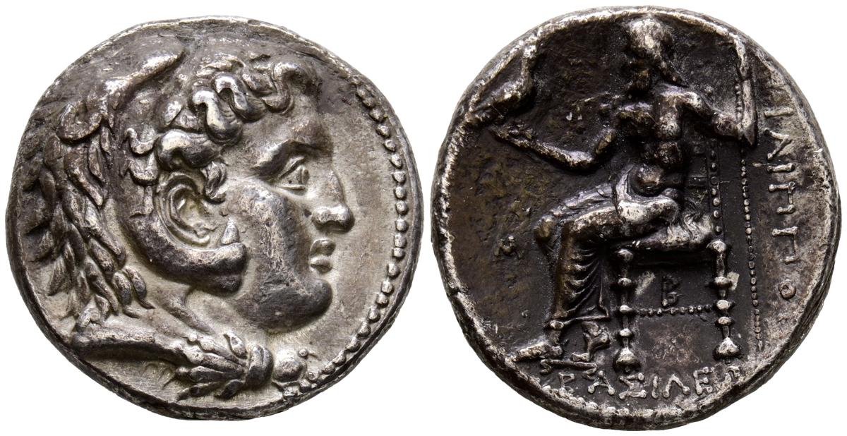 KINGDOM OF MACEDONIA, Philip III Arrhidaeus. Tetradrachm. (Ar. 16.99g/26mm). 323-317 BC (Price P182). Anv: Head of Heracles with lion skin on the right. Rev: Zeus seated left carrying scepter and eagle, in front M, below throne B, around Greek legend. Good Very Fine/ Very Fine.