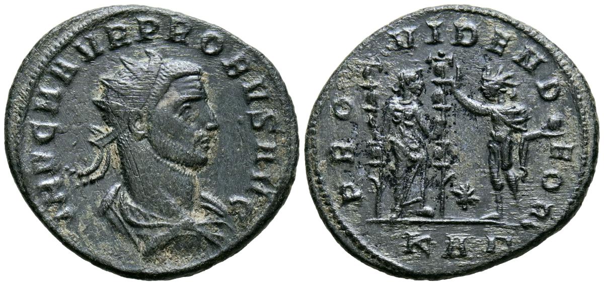 PROBUS. Antoninian. (Ae. 3.85g/23mm). 276-282 AD Serdica. (RIC 845). Anv: Radiated and cuirassed bust of Probus on the left, around legend: IMP CM AVR PROBVS AVG. Rev: Providentia standing on the right carrying two banners, in front Sol standing on the left carrying a globe, among them a star, in exergue: KAr, around legend: PROVIDEN DEOR. Very Fine.