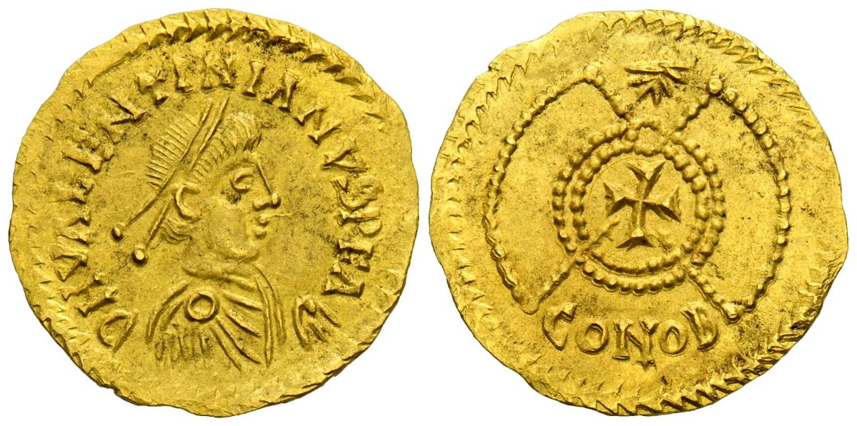SUEVAS AUCTIONS, in the name of Valentinian III. Imitation tent. (Au. 1.53g/16mm). 424-455 AD Gallaecia. (Chaves 21). Anv: Diademed and draped bust to the right, around legend: DN VALENTINIANVS PF A. Rev: Crown with open sides, in the center cross inside laurea, above half a star, below legend: CONOB. Good Very Fine. Very rare example, a similar one was offered at Aureo & Calicó, Auction 263 (10-29-2014), Lot No. 1143, and was sold for €6,000