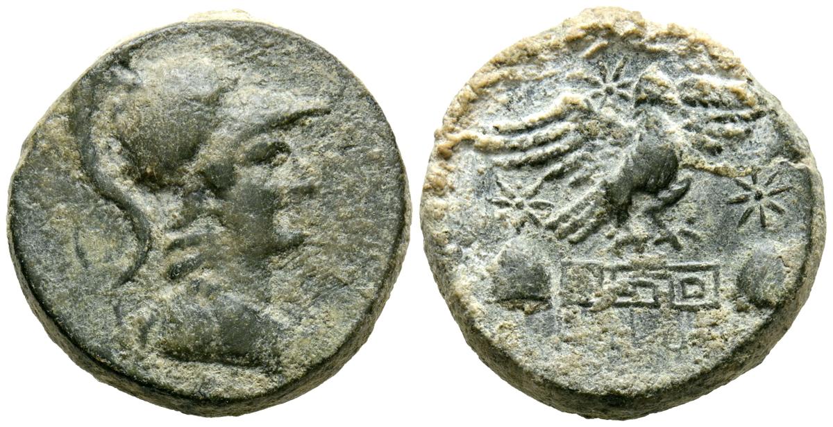 PHRYGIA, Apameia. Ae23. (Ae. 8.39g/21mm). 100-50 BC (SNG Copenhagen 167). Anv: Bust of Athens with Corinthian helmet with crest on the right. Rev: Eagle with star on it, between it two helmets of disoccurs and resting on the pattern of Meander, around Greek legend. Very Fine.