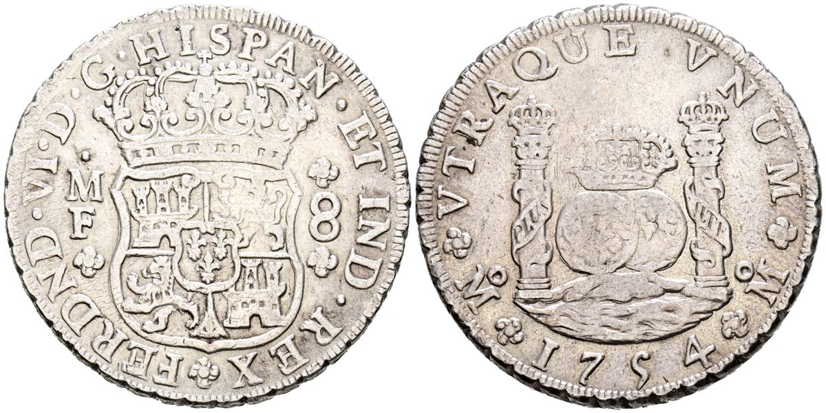 FERDINAND VI (1746-1759). 8 Reales (Ar. 26.95g/39mm). 1754/3. Mexico MF. (Cal-2019-480). Two reales crowns on the columns. Very Fine.