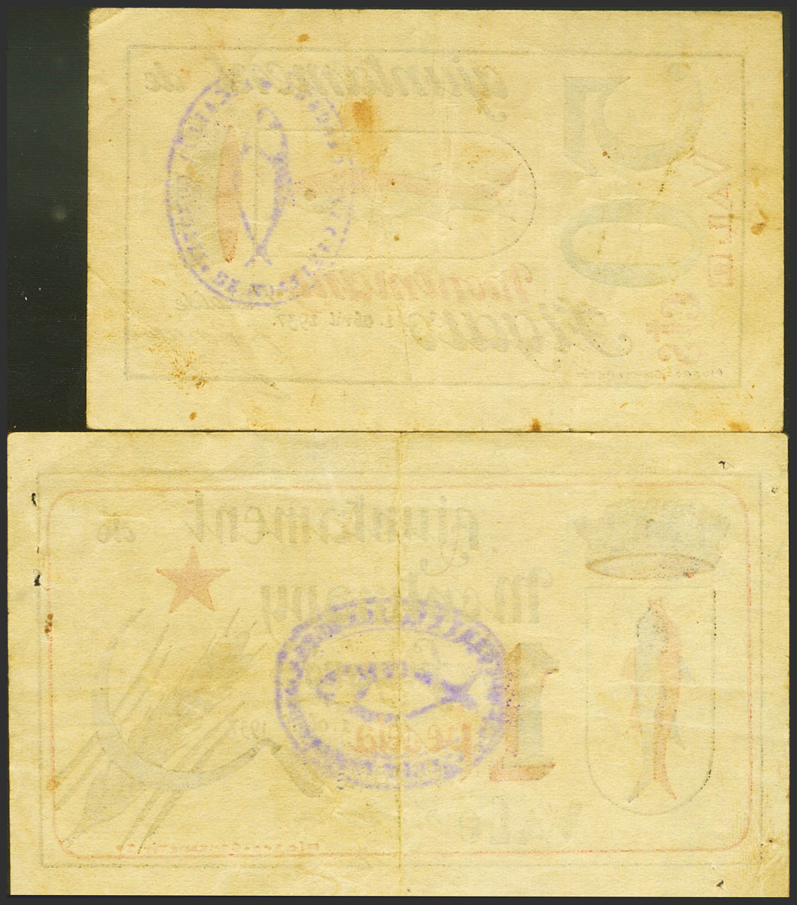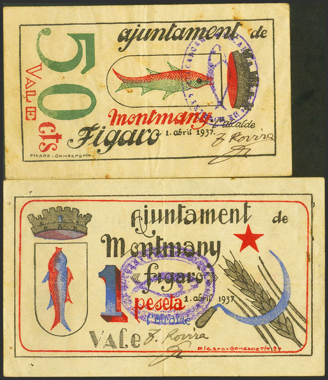 English MONTMANY (BARCELONA). 50 Cents and 1 Peseta. April 1, 1937. (González: 8798/99). Rare complete series, 1 staple stitch sts. Very Fine.