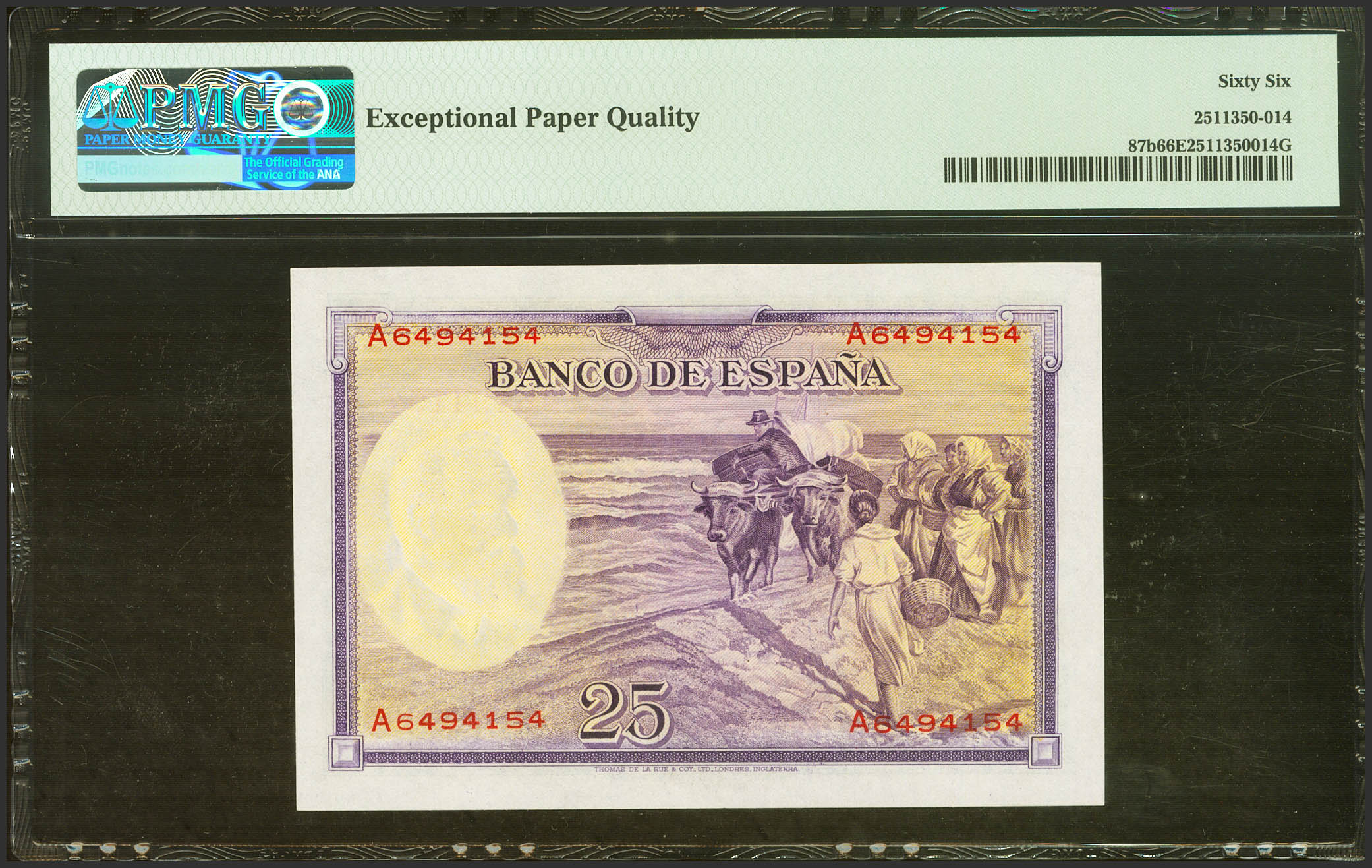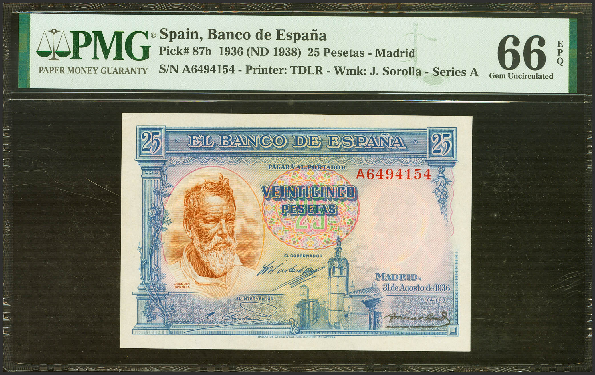 25 Pesetas. August 31, 1936. Series A. (Edifil 2023: 367a, Pick: 87b). Rare in this exceptional quality, original sizing. PMG66EPQ package.