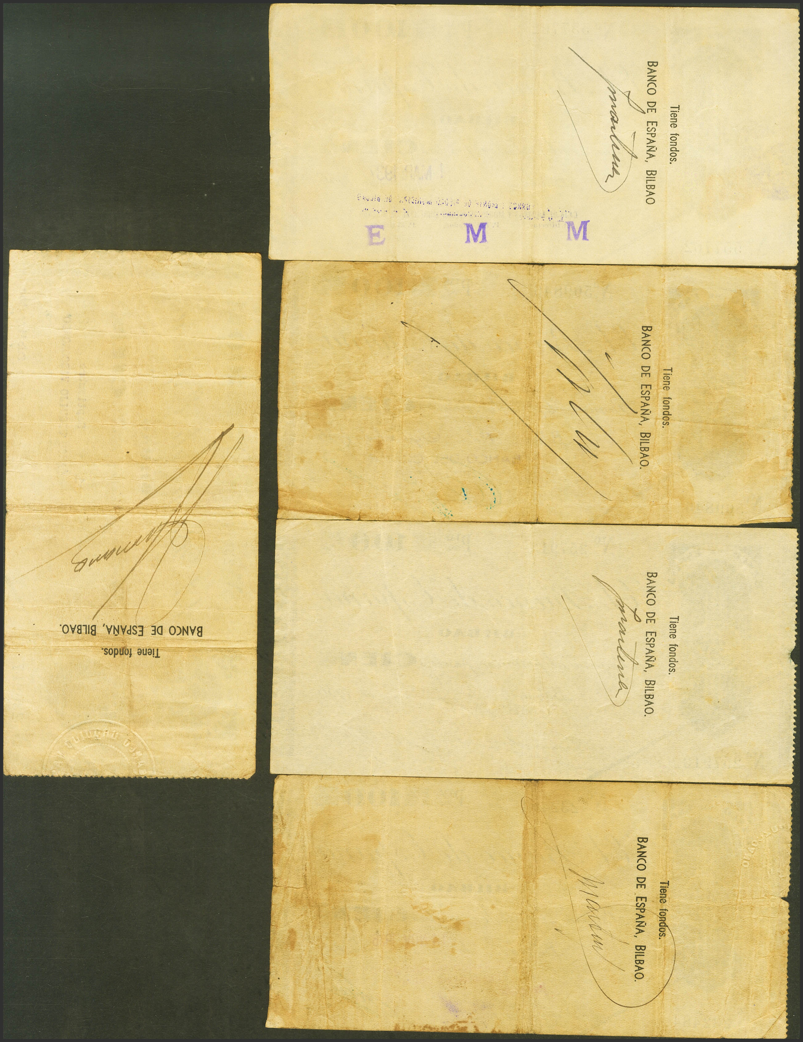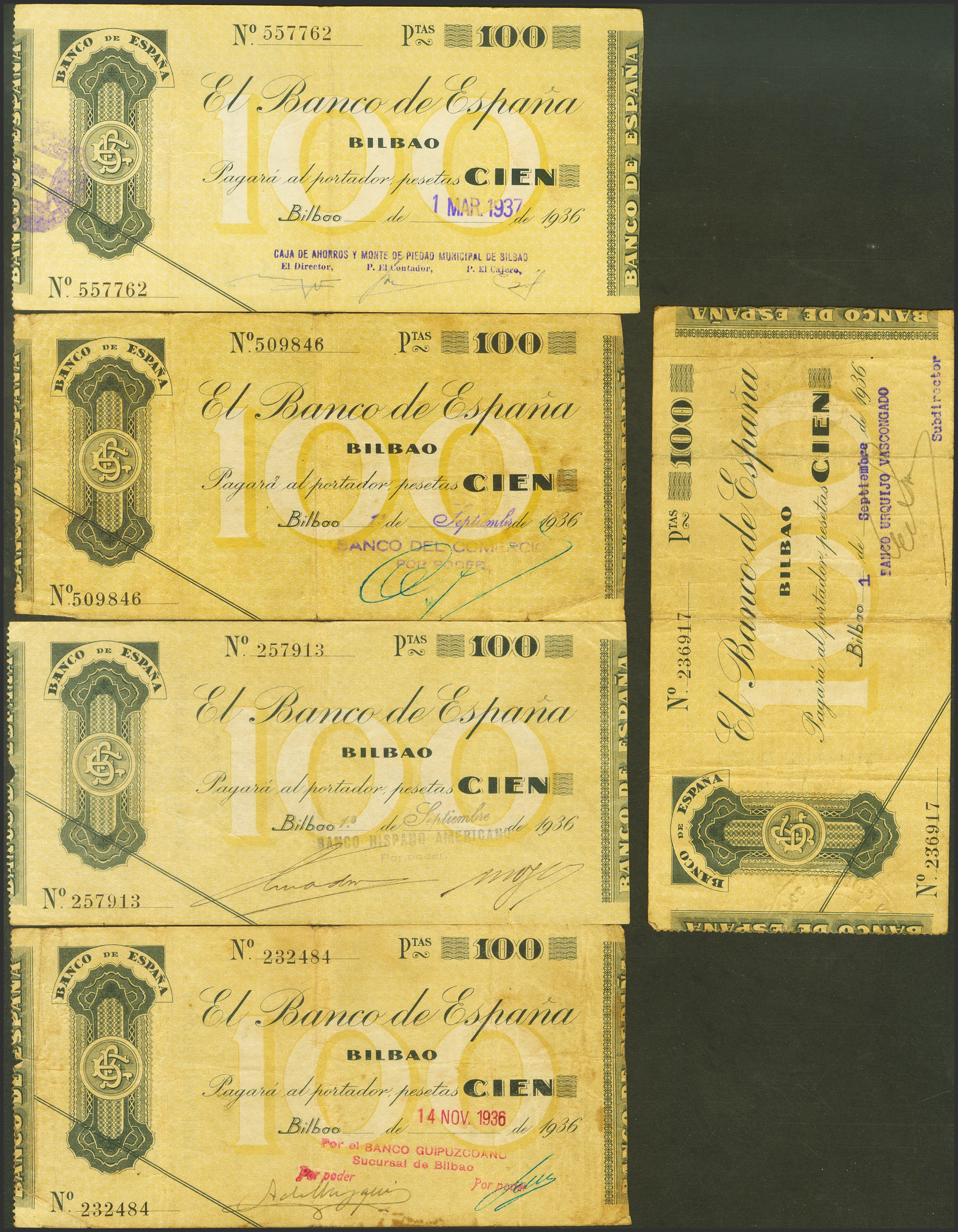 Set of 5 100 Pesetas banknotes from the Banco de Bilbao, issued in 1936, all of them without series and with various antesignatures. (Edifil 2023: 371). Very Fine.