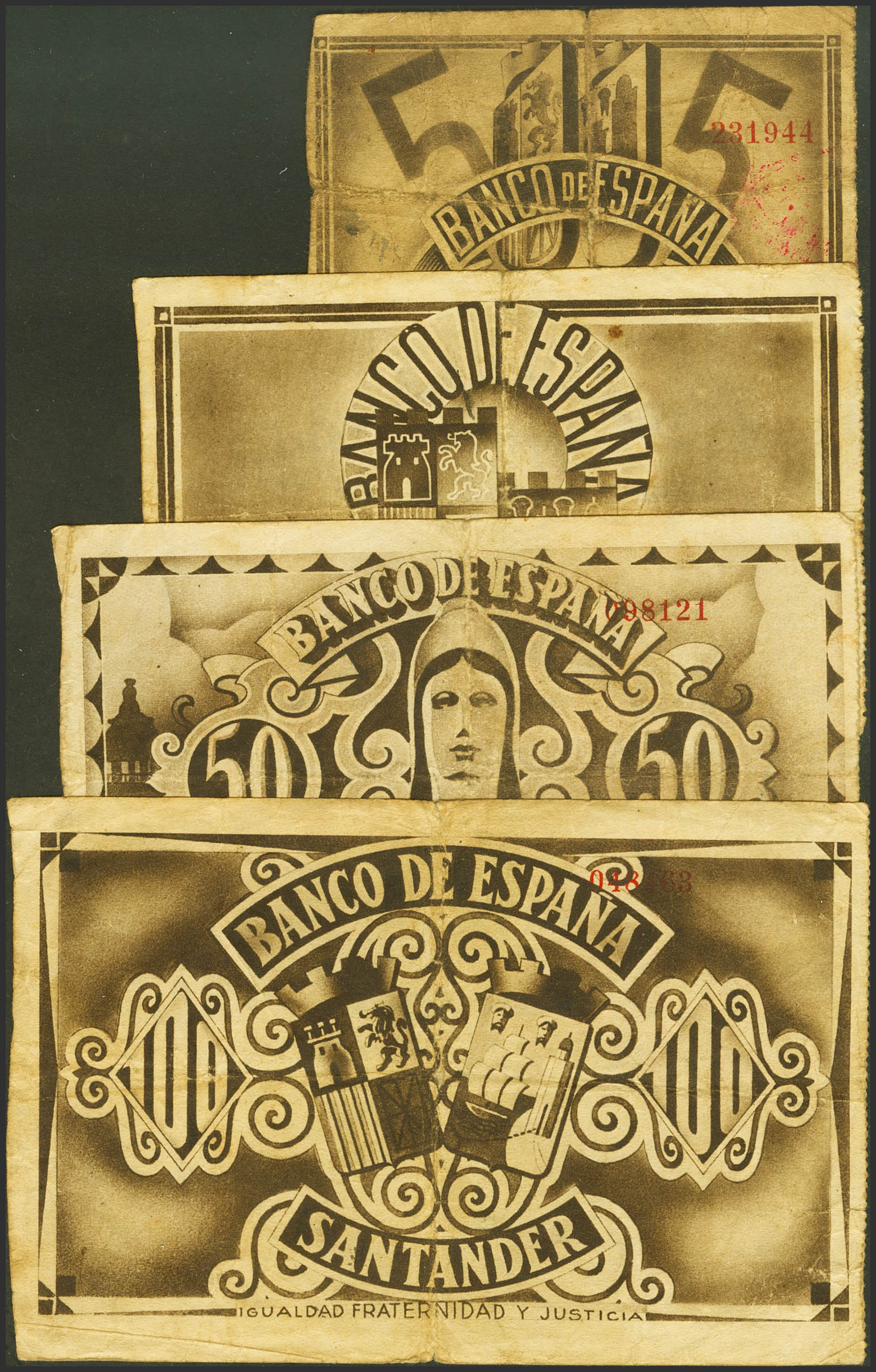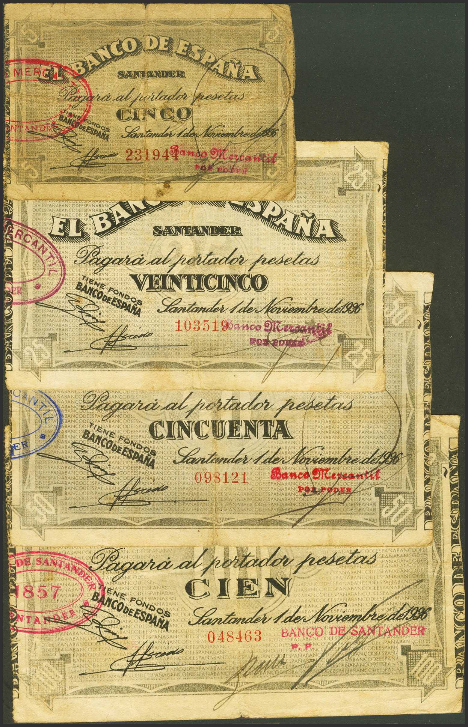 Series of 4 Bank of Spain banknotes from the Santander branch, in the absence of the 10 Pesetas, corresponding to the values of 5 Pesetas (presignature of Banco Mercantil), 25 Pesetas (presignature of Banco Mercantil), 50 Pesetas (presignature of Banco Mercantil) and 100 Pesetas (presigned by Banco de Santander), issued on November 1, 1936. (Edifil 2023: 375f, 377f. 378f, 379g). Unusual set. Good Fine/ Very Good.