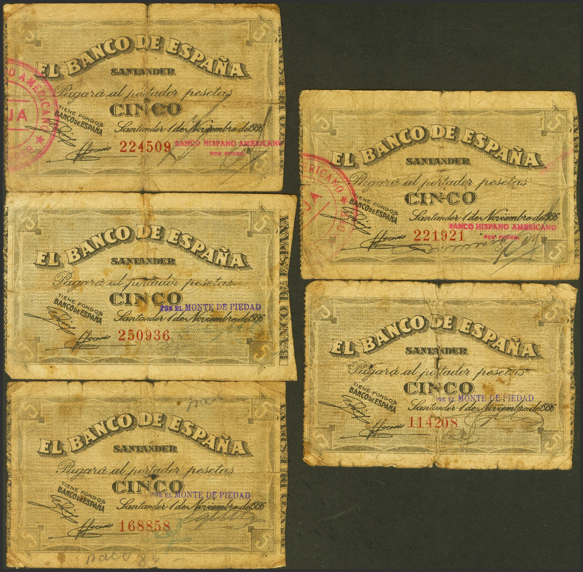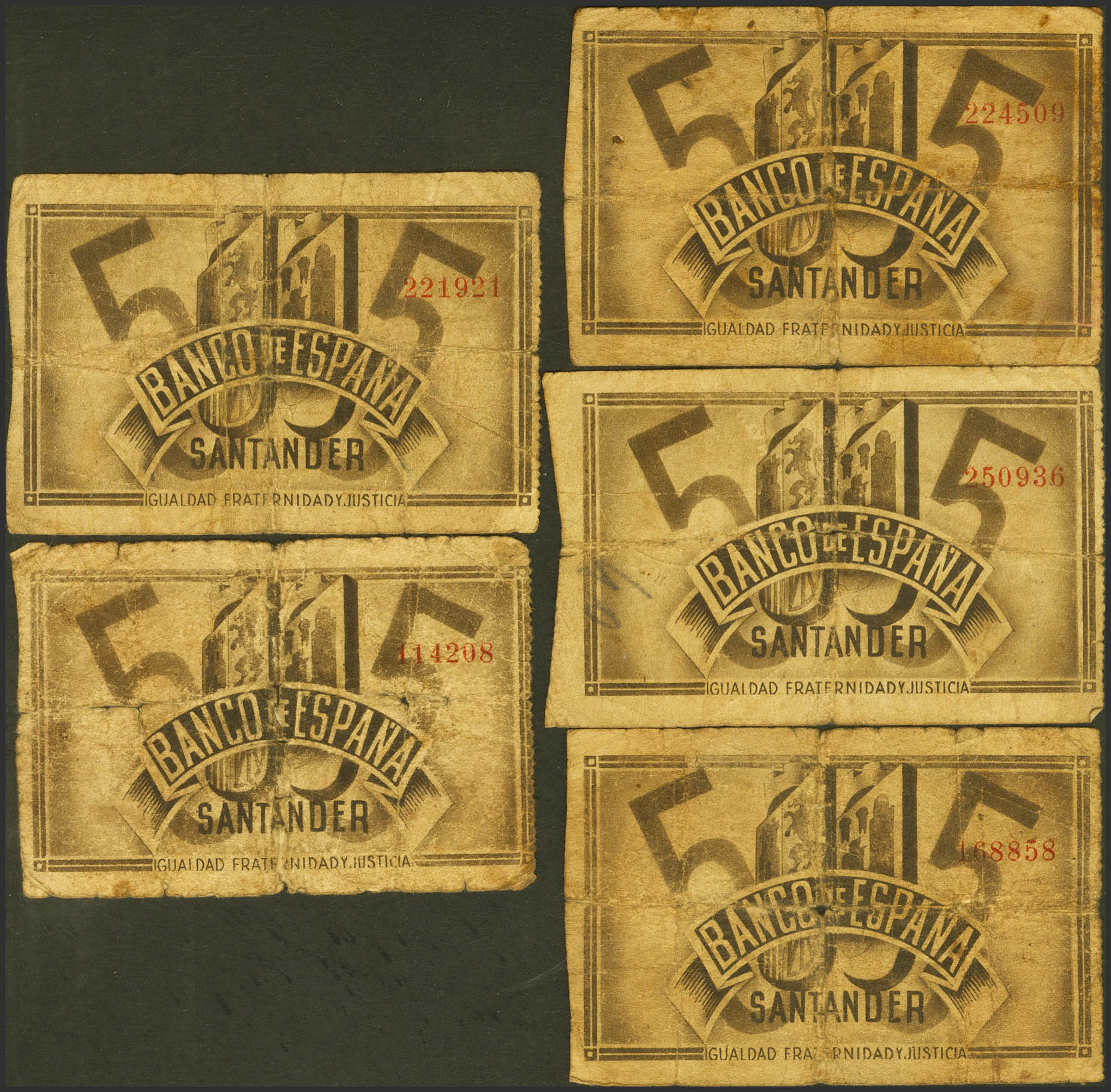 Set of 5 5 Pesetas banknotes from Banco de Santander, issued on November 1, 1936, all of them without series and with various antesignatures. (Edifil 2023: 375). Almost Very Fine/ Good Fine.