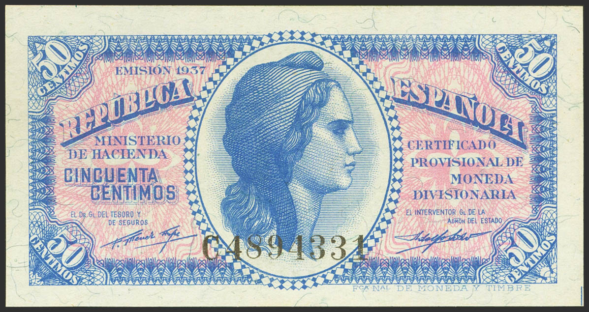 50 Cents. 1937. Series C, last series issued. (Edifil 2021: 391a). Original sizing. Almost Uncirculated.