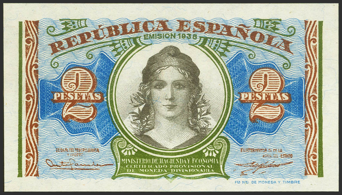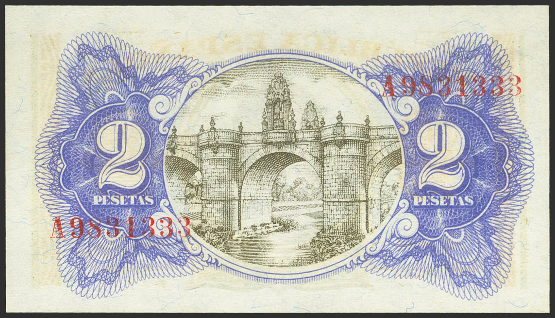 2 Pesetas. 1937. Ministry of Finance. Series A. (Edifil 2021: 393). Original sizing. Uncirculated.