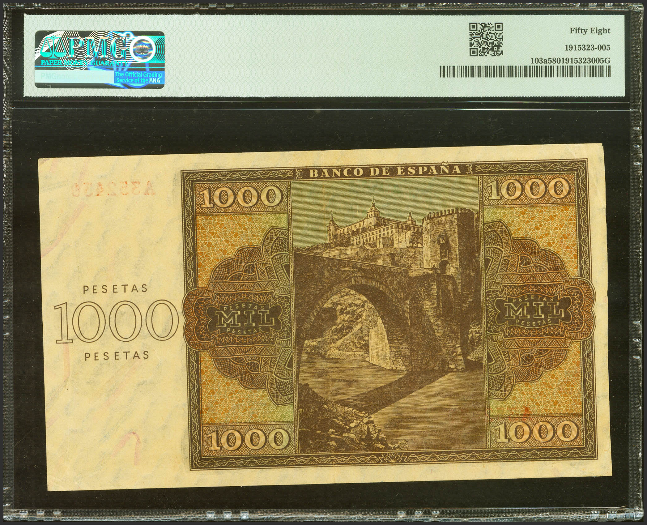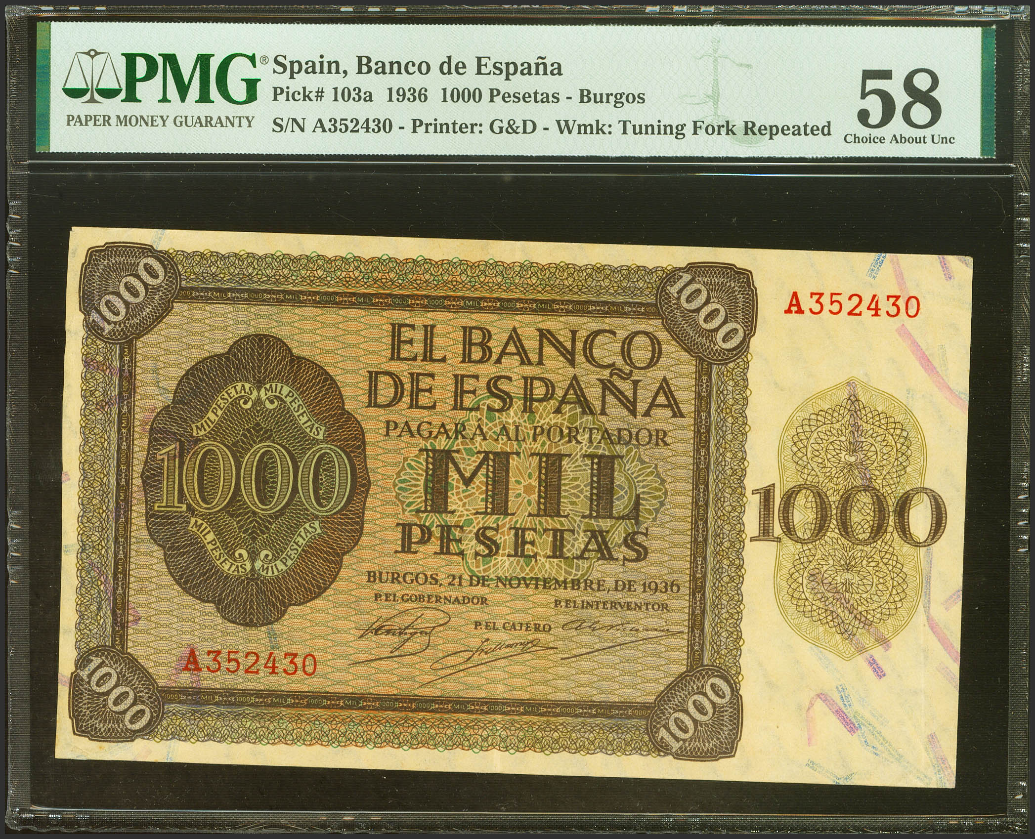 1000 Pesetas. November 21, 1936. Series A. (Edifil 2023: 423, Pick: 103a). Very rare in this quality. EBC++. PMG58 encapsulation.