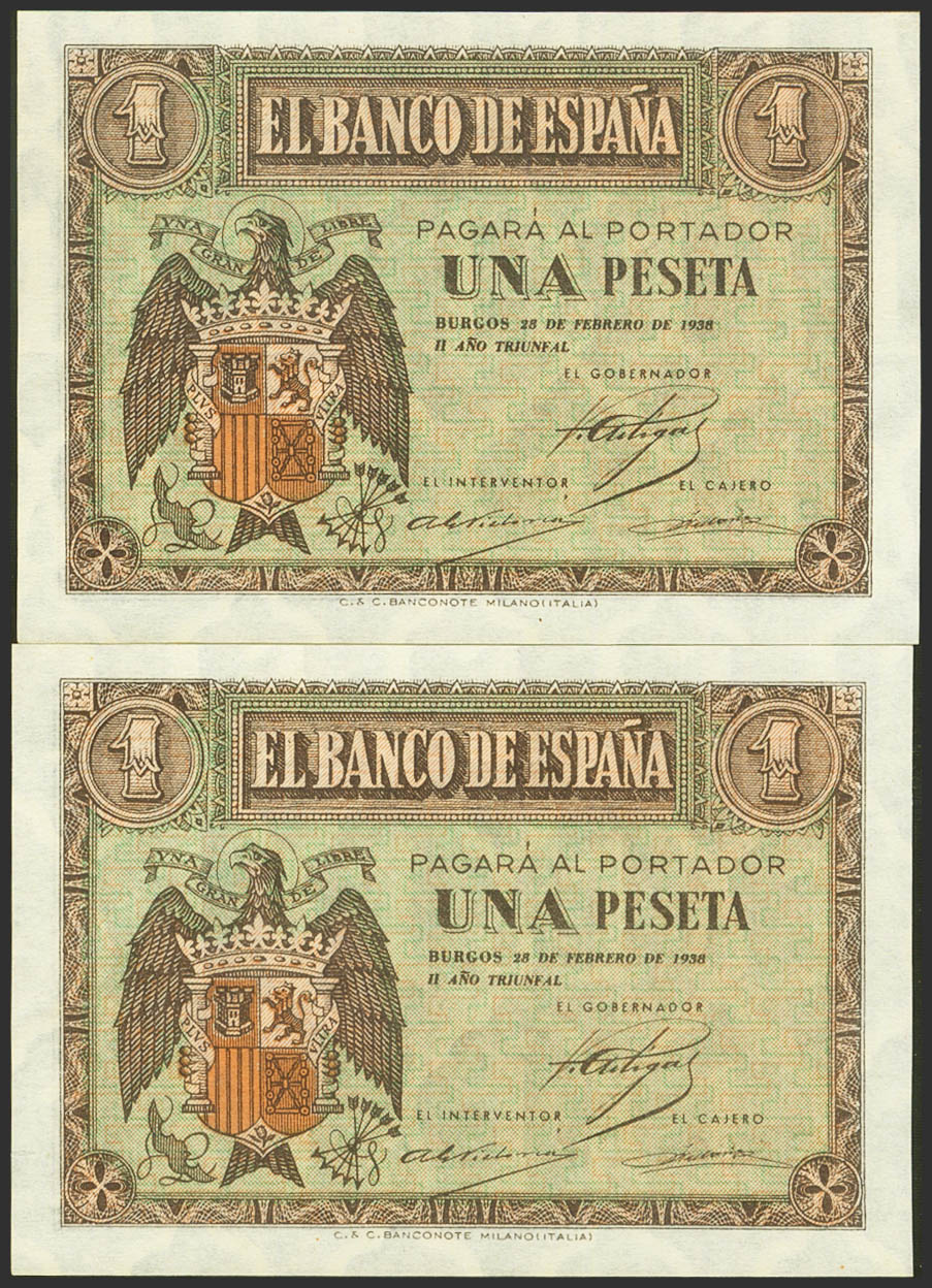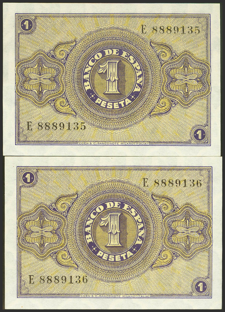 English 1 Peseta. February 28, 1938. Correlative pair. Series E. (Edifil 2021: 427a). It retains all its original finish. Almost Uncirculated.