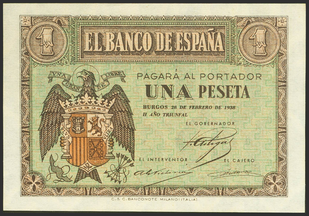 1 Peseta. February 28, 1938. Series F. (Edifil 2021: 427a). Original sizing. Uncirculated.
