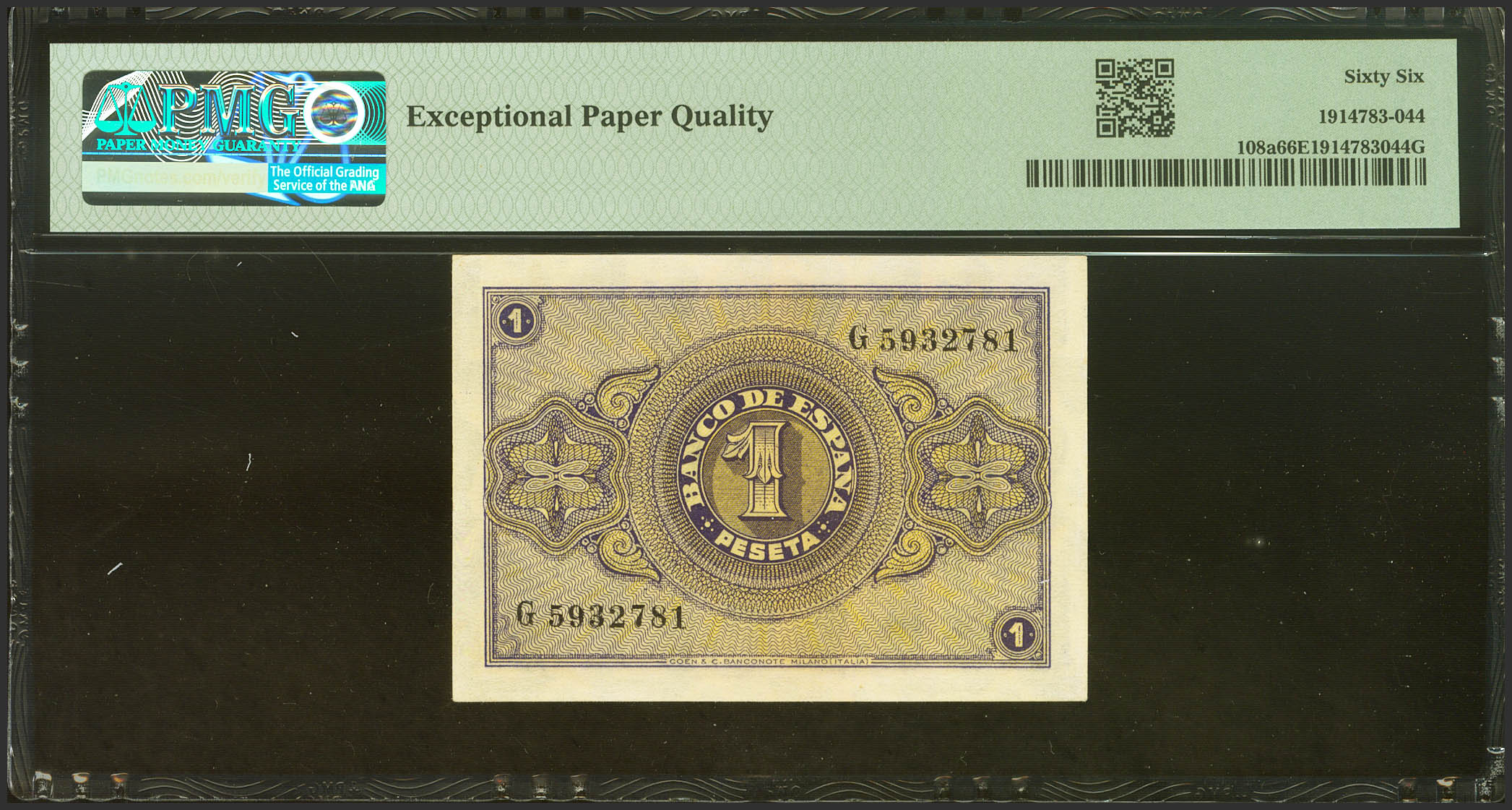 English 1 Peseta. April 30, 1938. Series G. (Edifil 2021: 428a, Pick: 108a). Unusual in this quality, original sizing. Uncirculated. PMG66EPQ package.