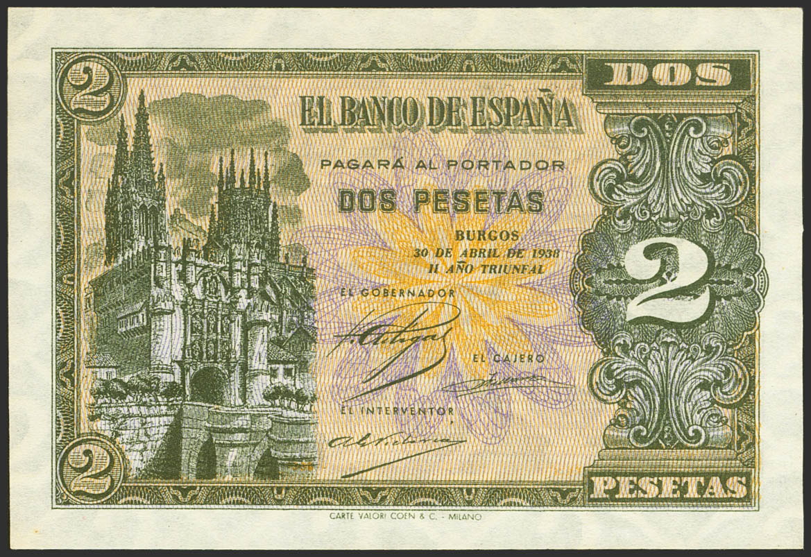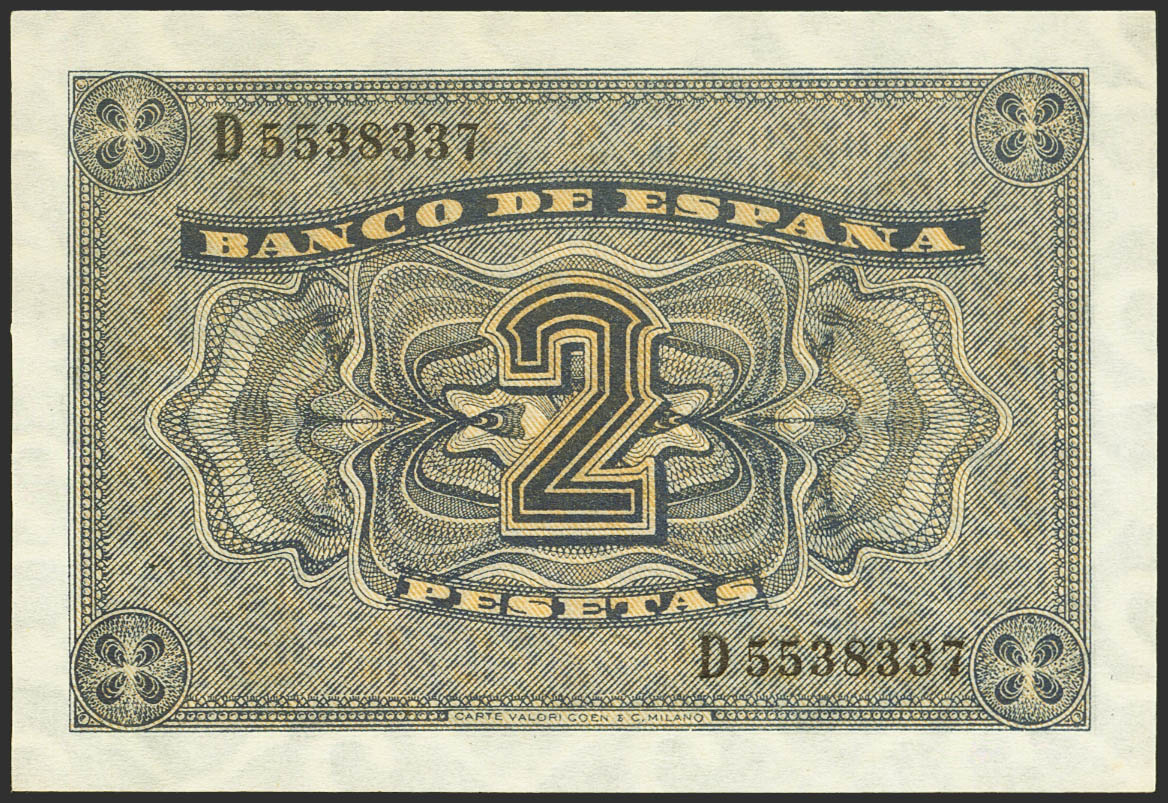 English 2 Pesetas. April 30, 1938. Series D. (Edifil 2021: 429a). Original sizing. Uncirculated.