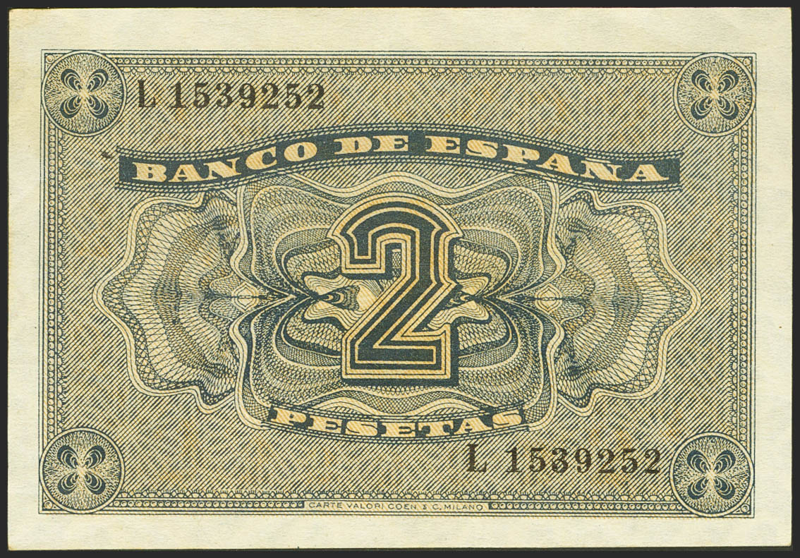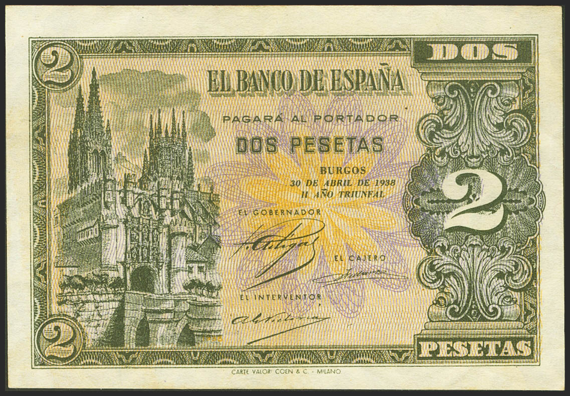 2 Pesetas. April 30, 1938. Series L. (Edifil 2021: 429a). It retains much of the original finish. Extremely Fine.