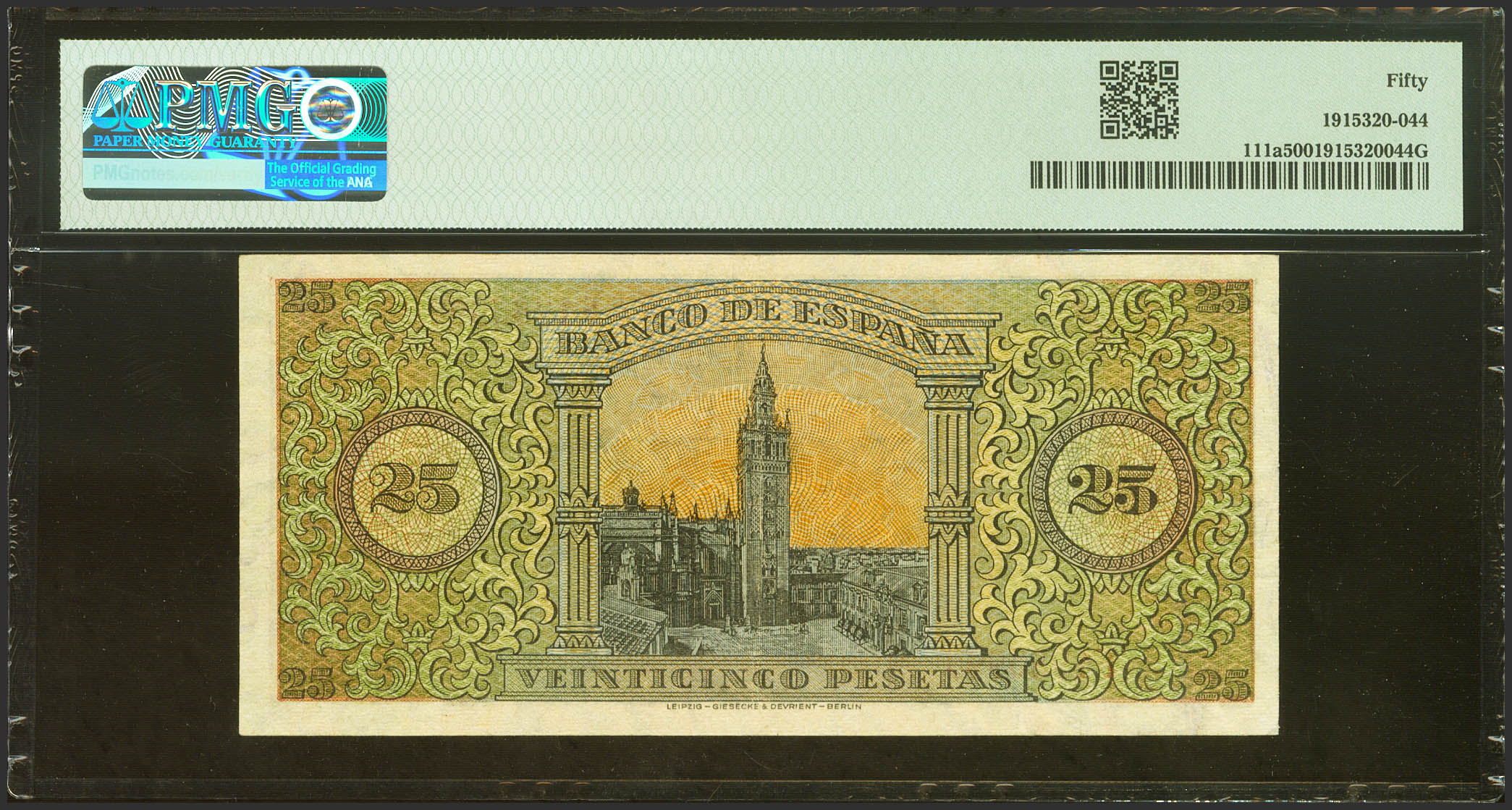 25 Pesetas. May 20, 1938. Series F, last series issued. (Edifil 2023: 430b, Pick: 111a). Extremely Fine. PMG50 encapsulation.