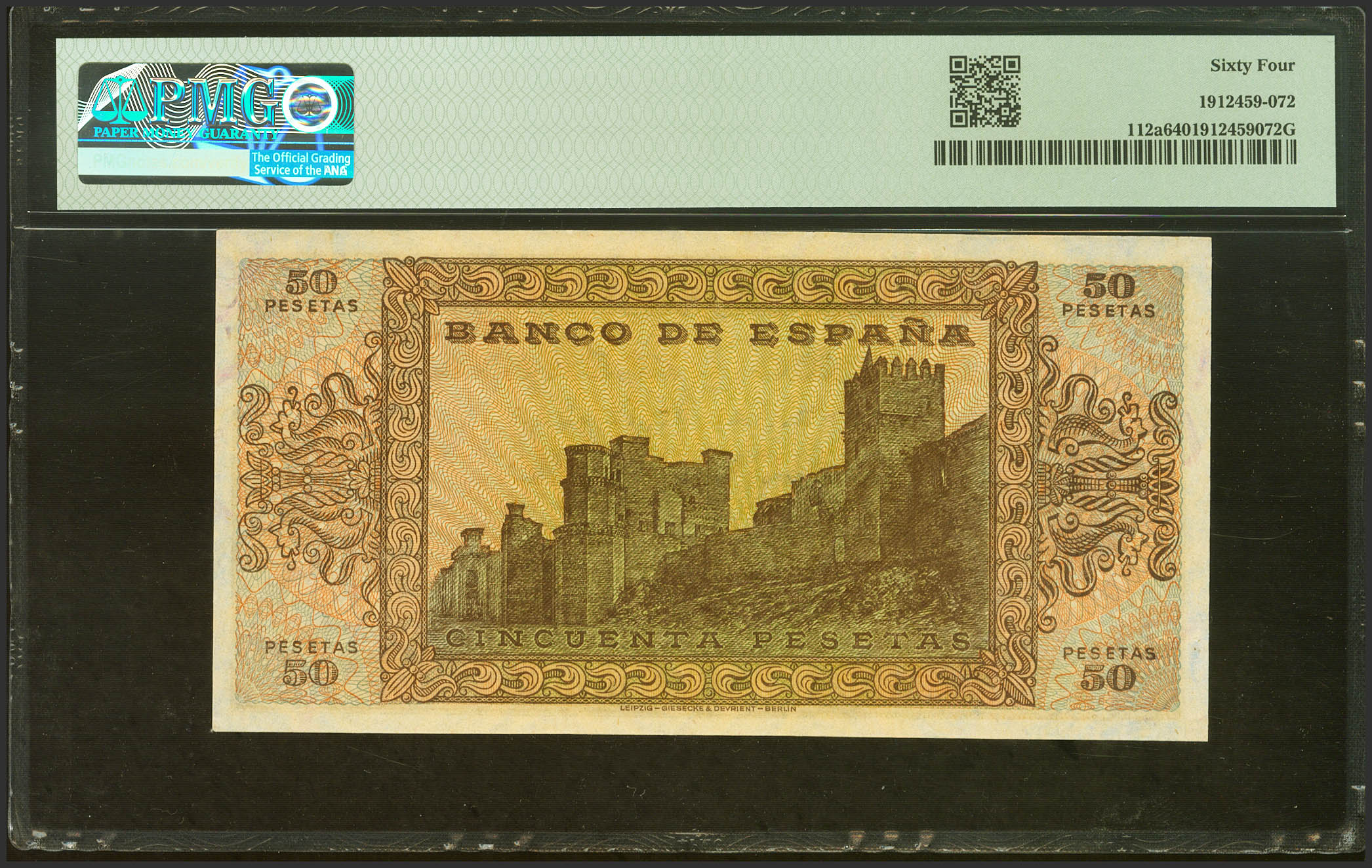 50 Pesetas. May 20, 1938. Series C. (Edifil 2021: 431a, Pick: 112a). Unusual. Uncirculated. PMG64 encapsulation.