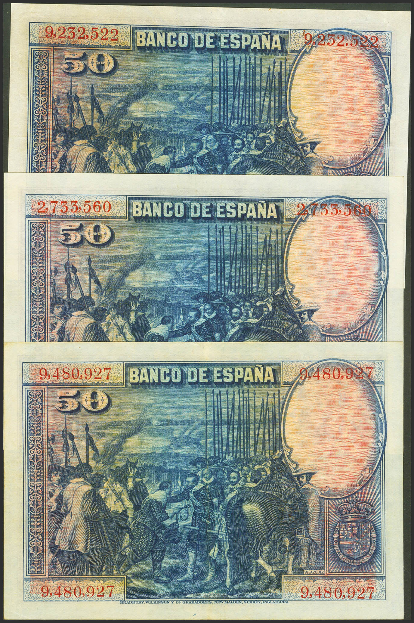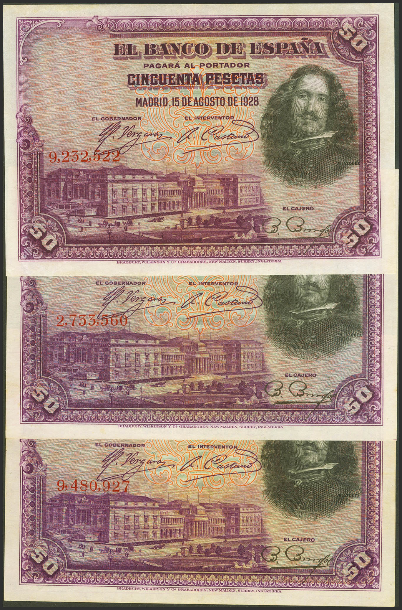 Set of 3 50 Pesetas banknotes issued on August 15, 1928, all of them without series. (Edifil 2023: 329). Good Very Fine.