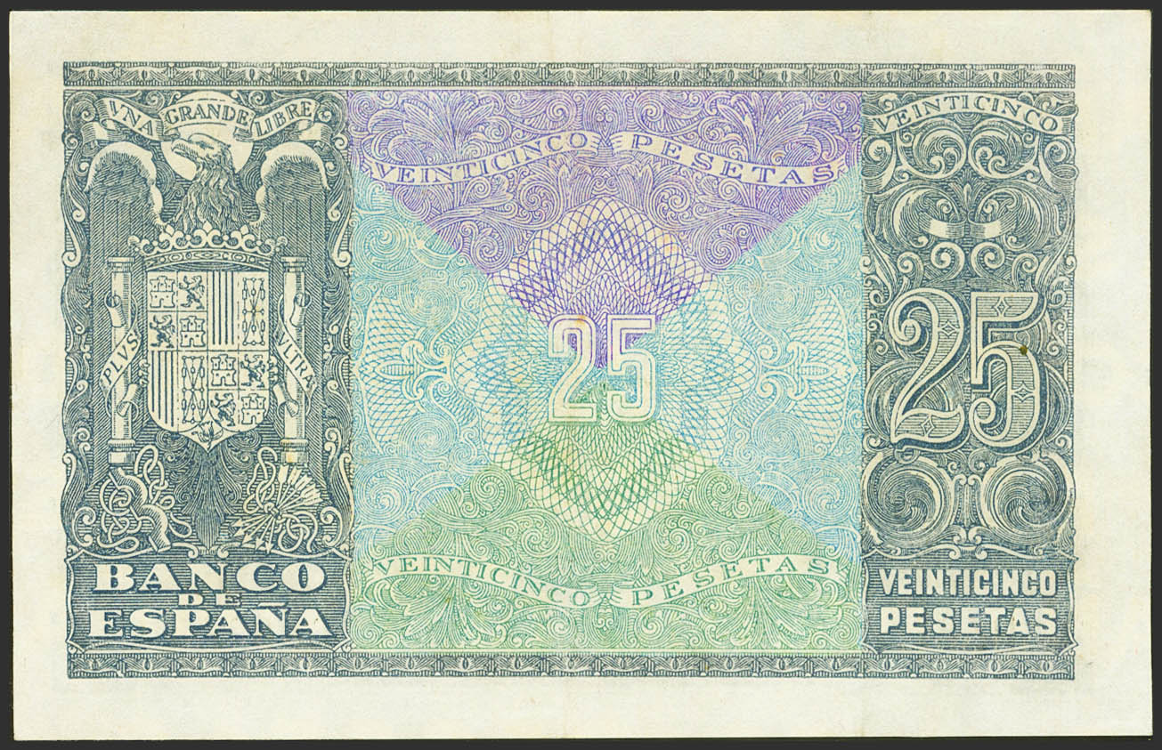English 25 Pesetas. January 9, 1940. Series B. (Edifil 2023: 436a). It retains part of its original finish. Extremely Fine.