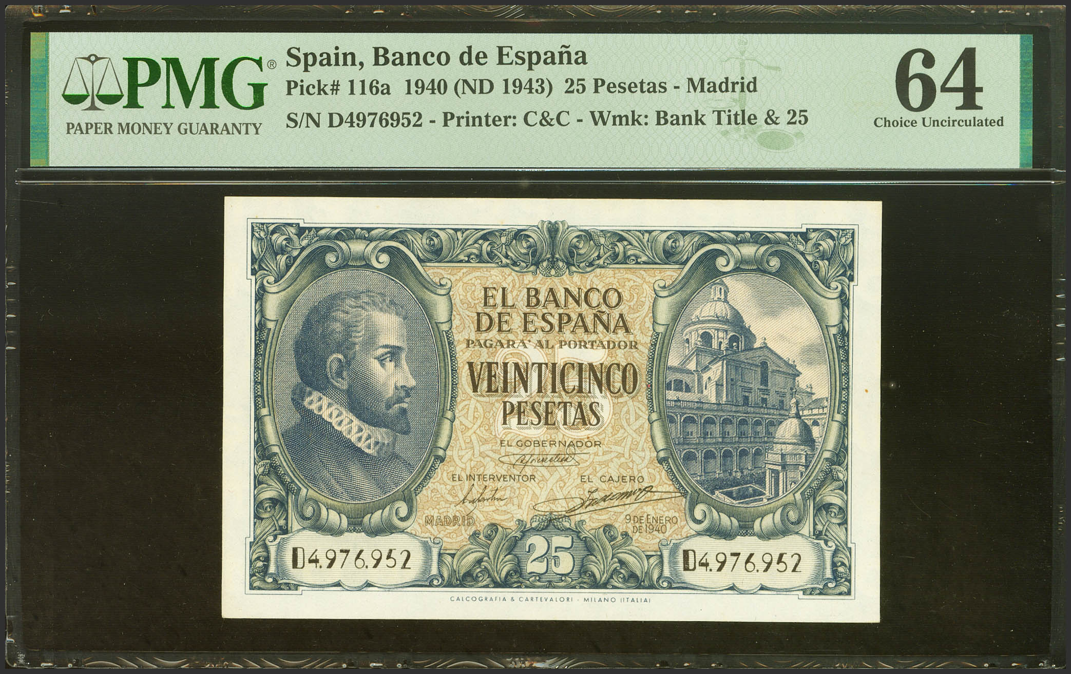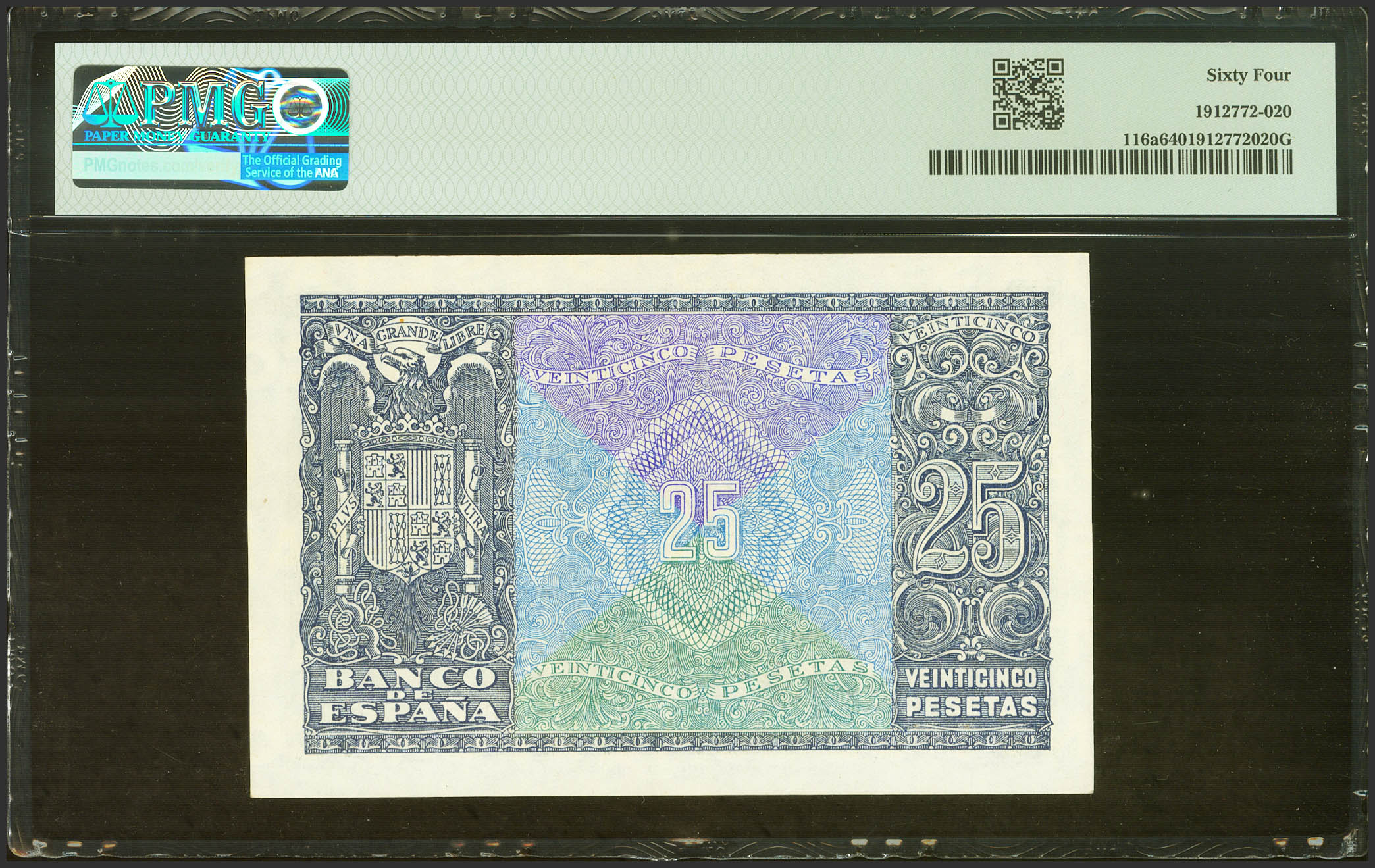 25 Pesetas. January 9, 1940. Series D. (Edifil 2021: 436a, Pick: 116a). Unusual. Uncirculated. PMG64 encapsulation.