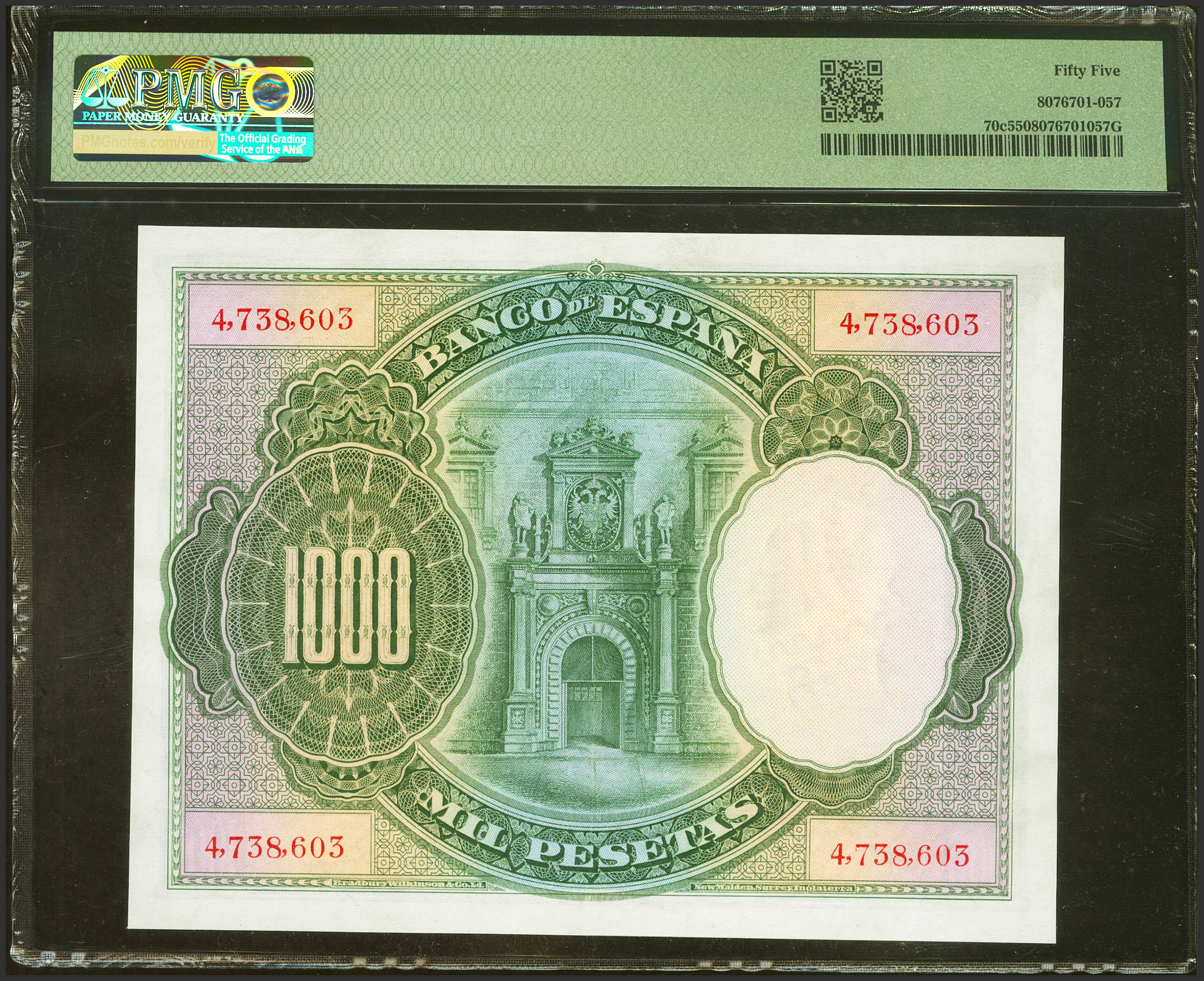 English 1000 Pesetas. July 1, 1925. Without series and numbering after 3646000. (Edifil 2021: 351, Pick: 70c). Unusual in this quality. Good Extremely Fine. PMG55 encapsulation.