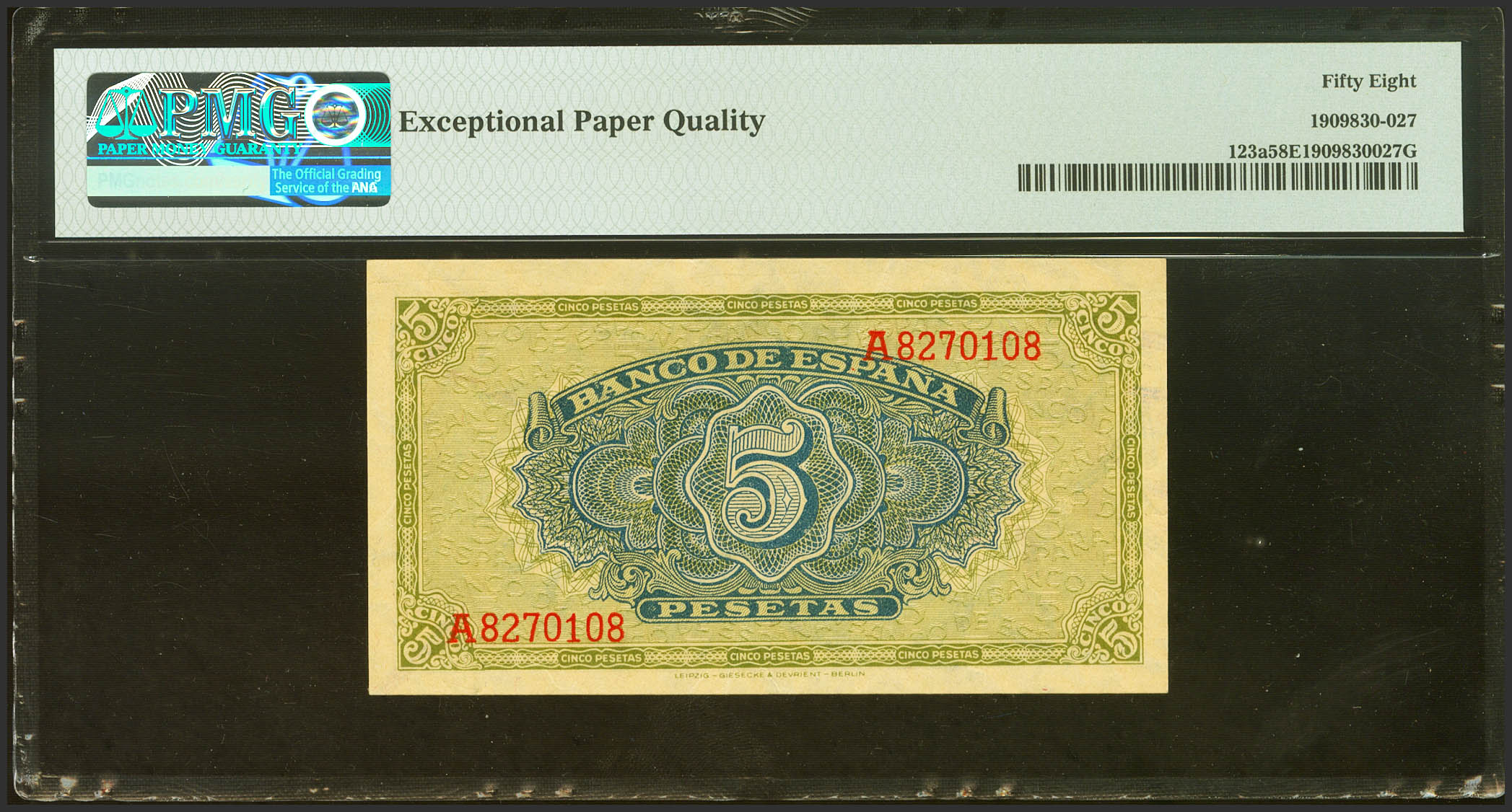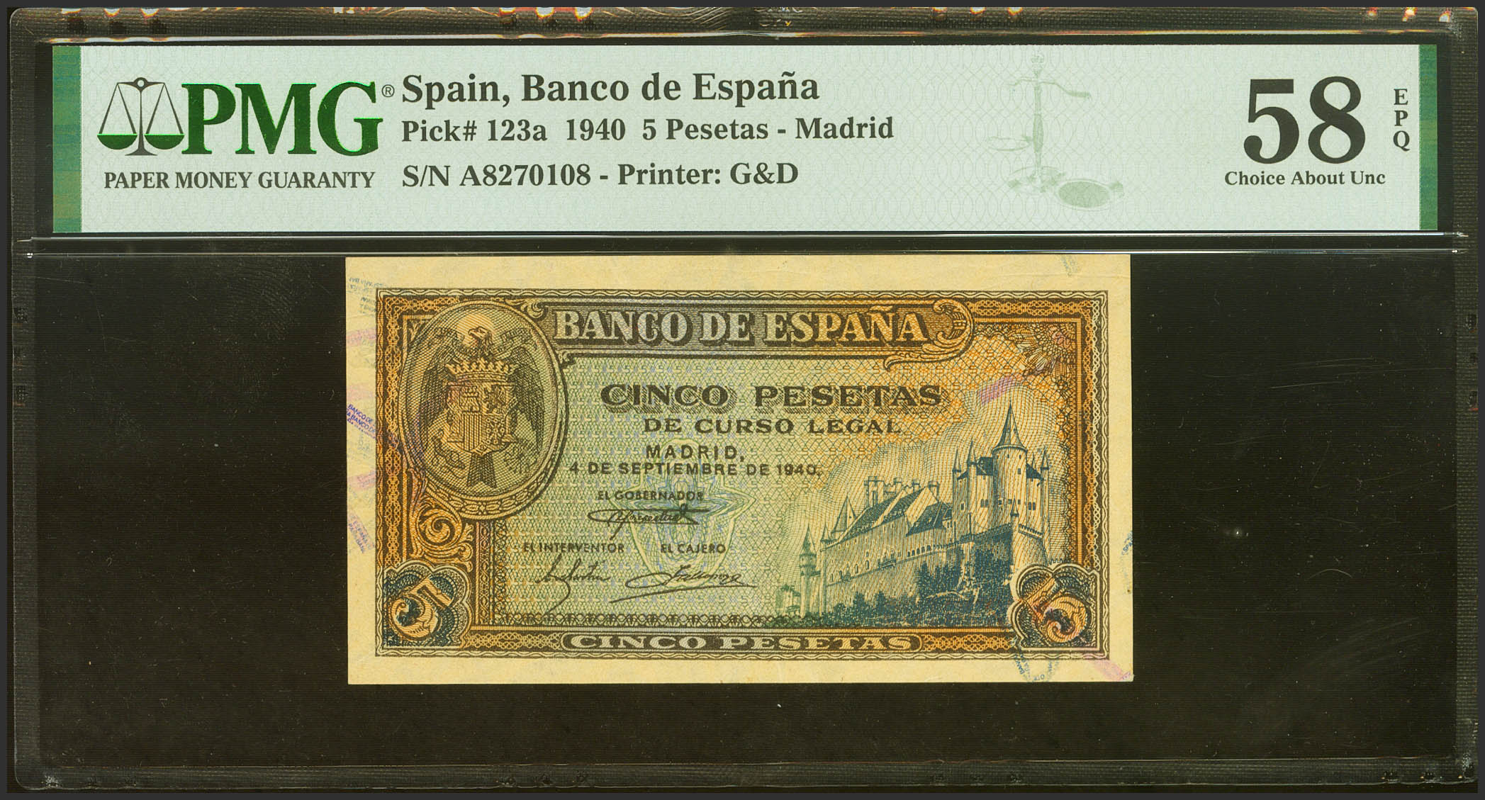 English 5 Pesetas. September 4, 1940. Series A. (Edifil 2021: 443, Pick: 123a). EBC+++. Original sizing. PMG58EPQ package.
