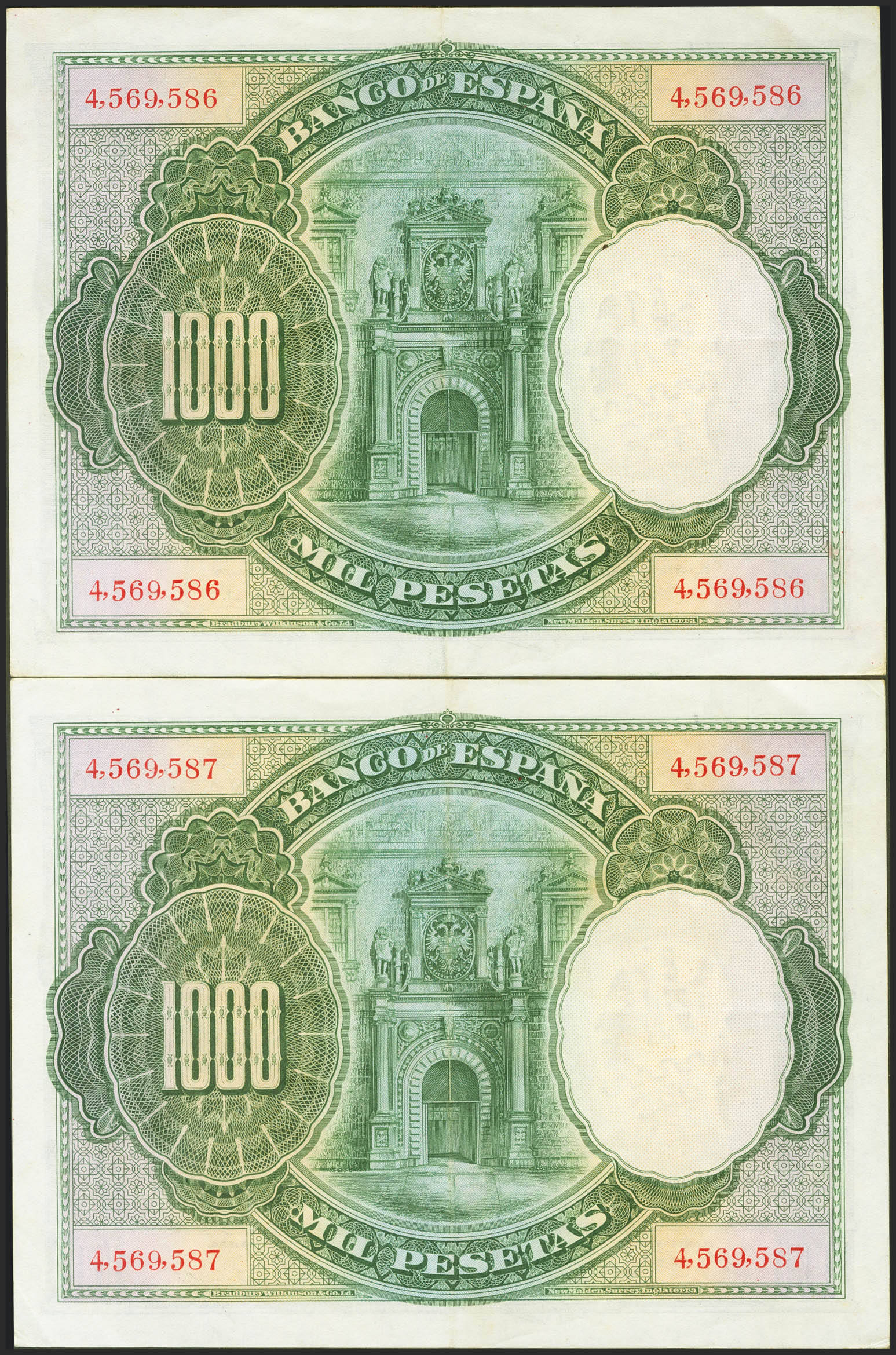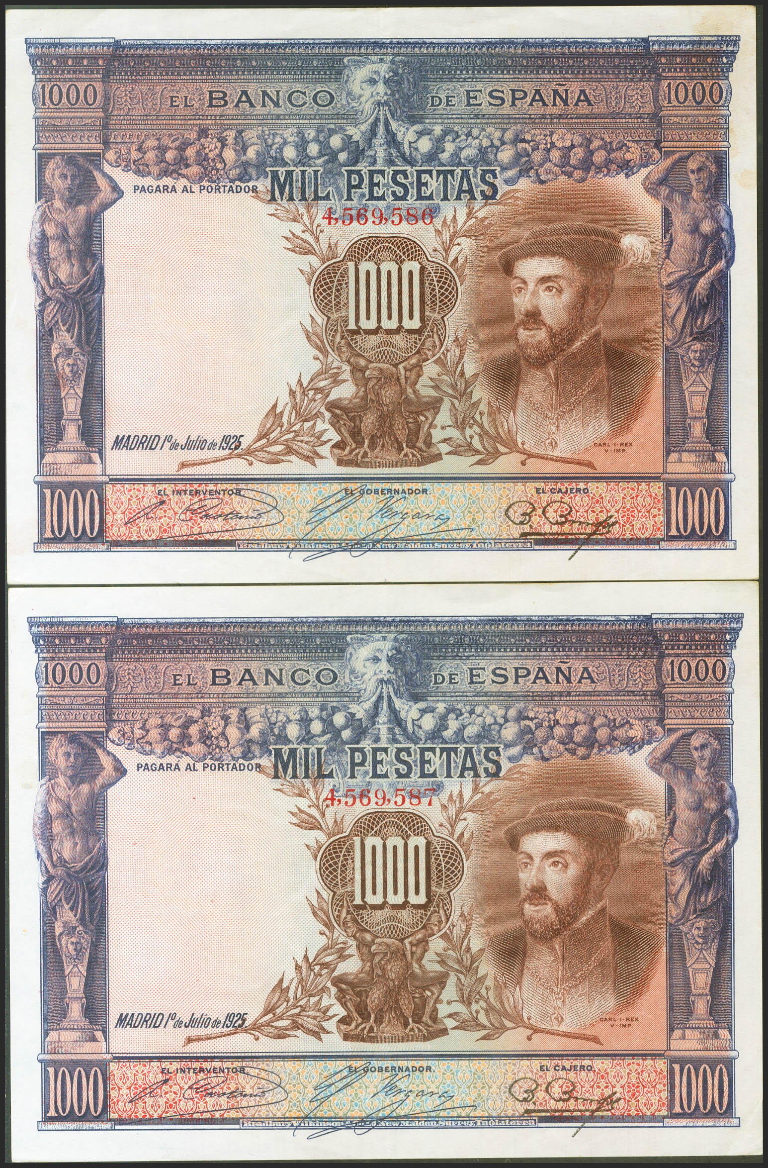 1000 Pesetas. July 1, 1925. Correlative couple. Without series and numbering after 3646000. (Edifil 2021: 351, Pick: 70c). It retains part of the original finish. Almost Extremely Fine.