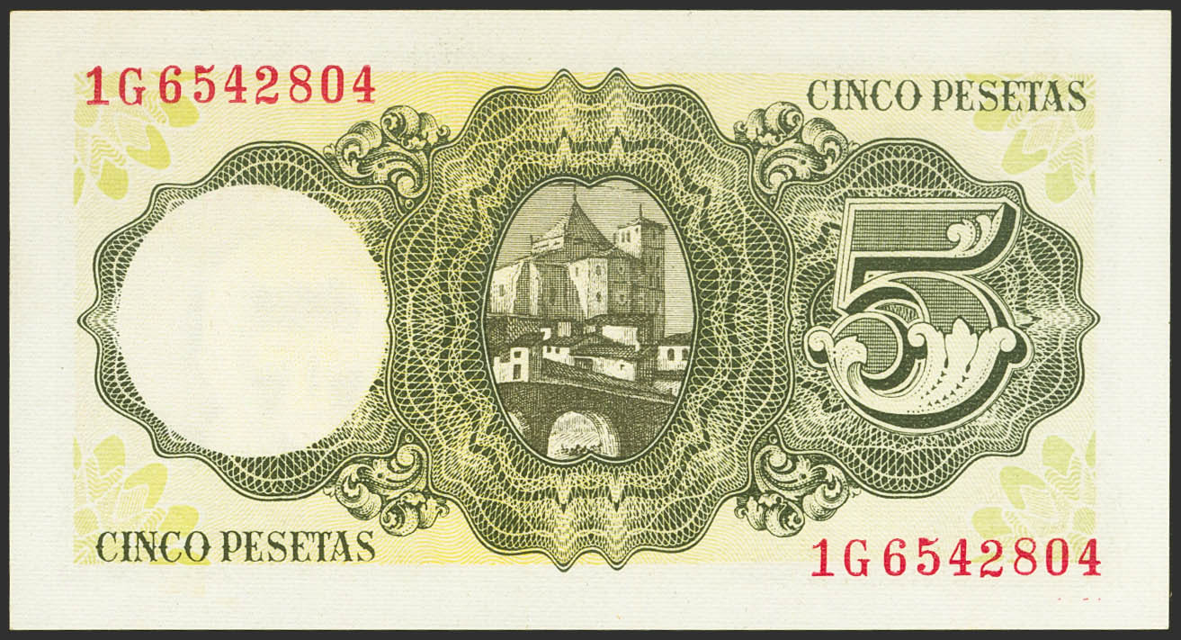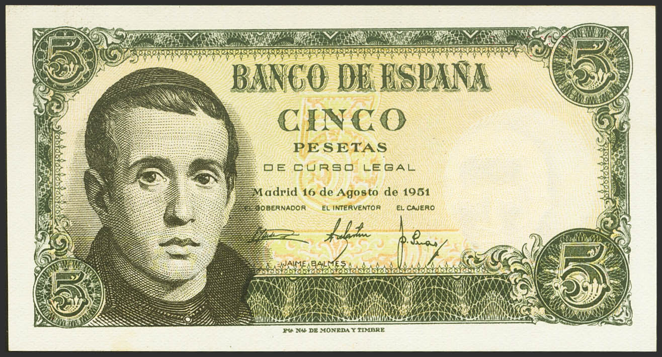 5 Pesetas. August 16, 1951. Series 1G. (Edifil 2021: 459a). Original sizing. Uncirculated.