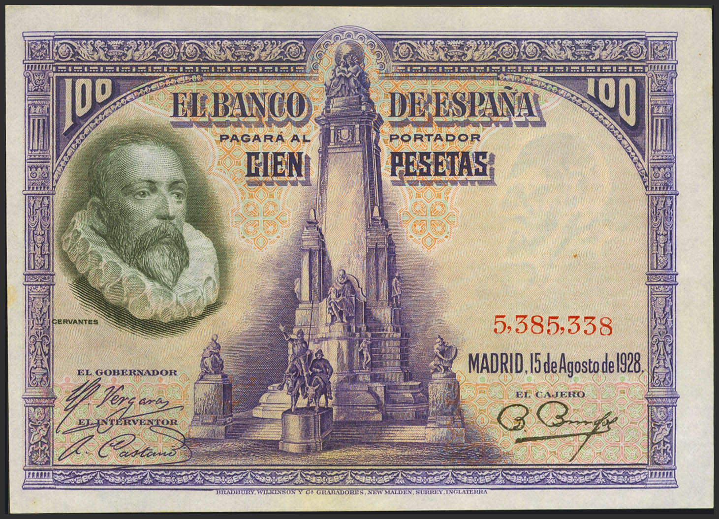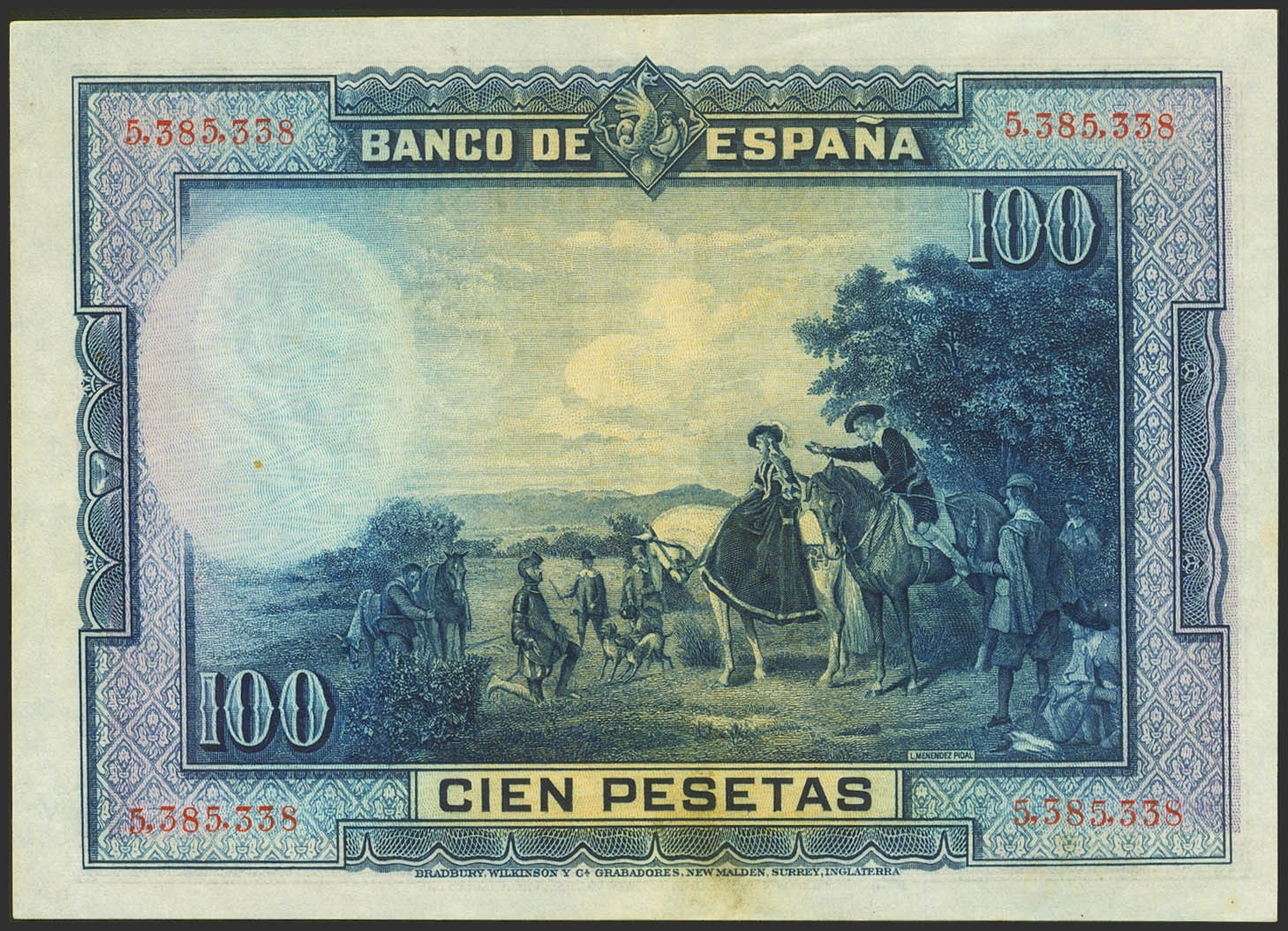 100 Pesetas. August 15, 1928. No series. (Edifil 2023: 355). It retains much of the original finish, stains from time. Good Extremely Fine.