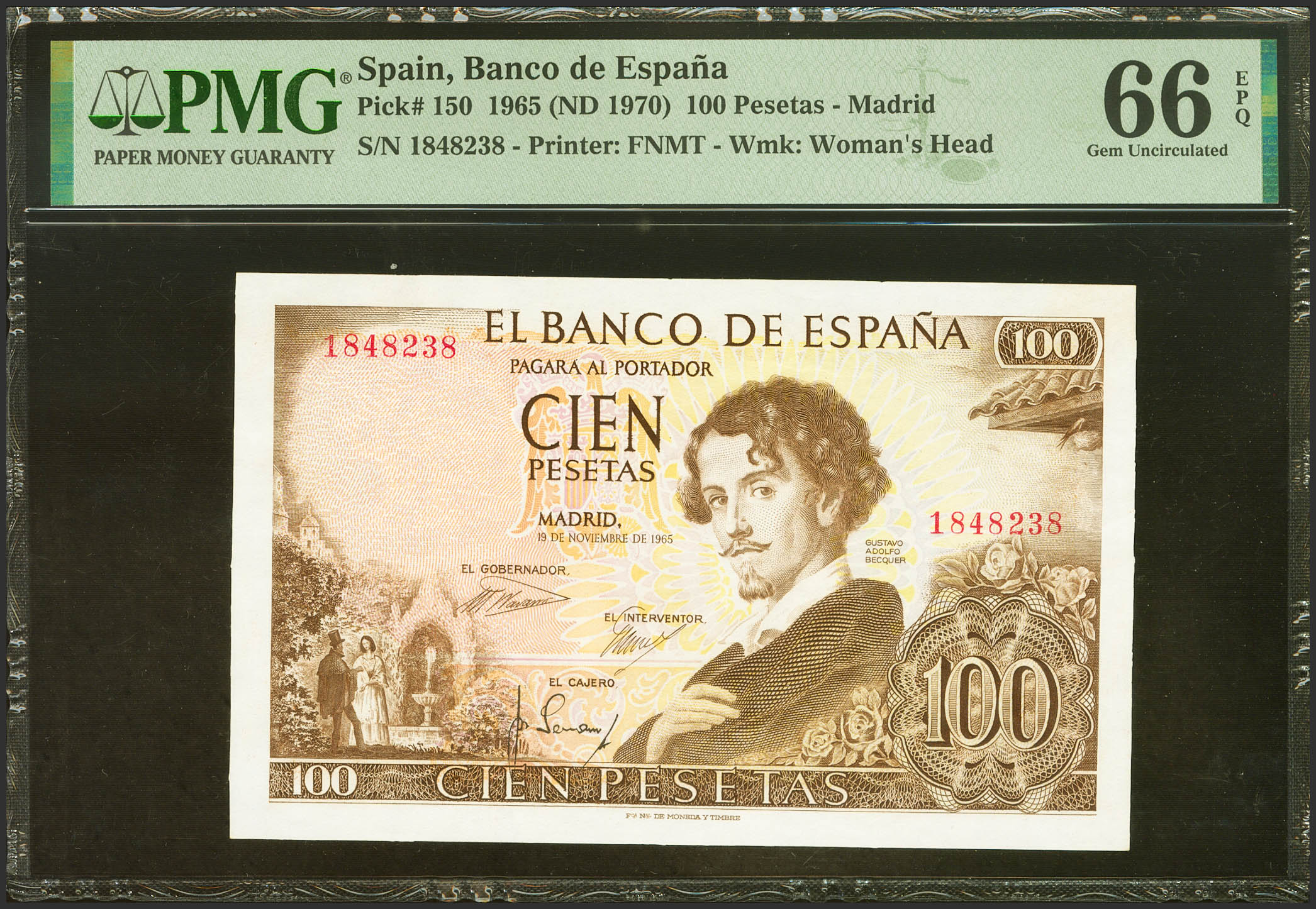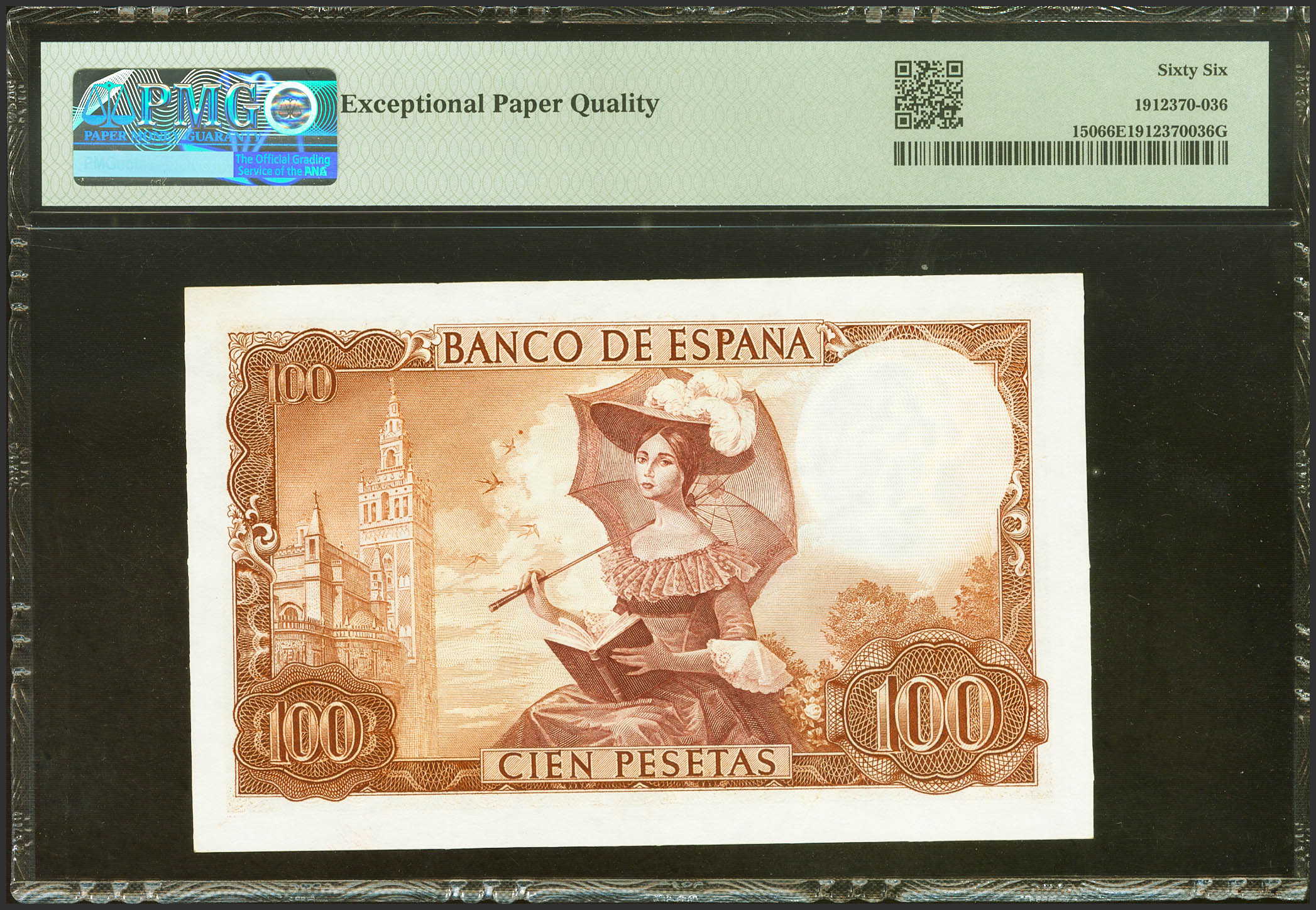 100 Pesetas. November 19, 1965. No series. (Edifil 2021: 470, Pick: 150). Unusual in this exceptional quality, original sizing. Uncirculated. PMG66EPQ package.