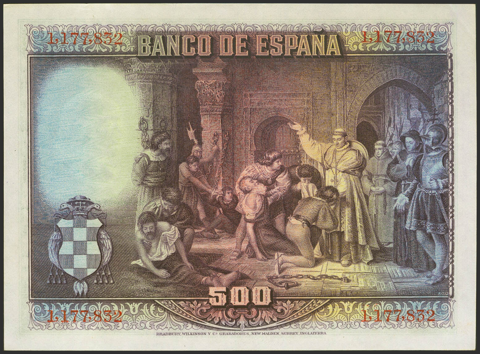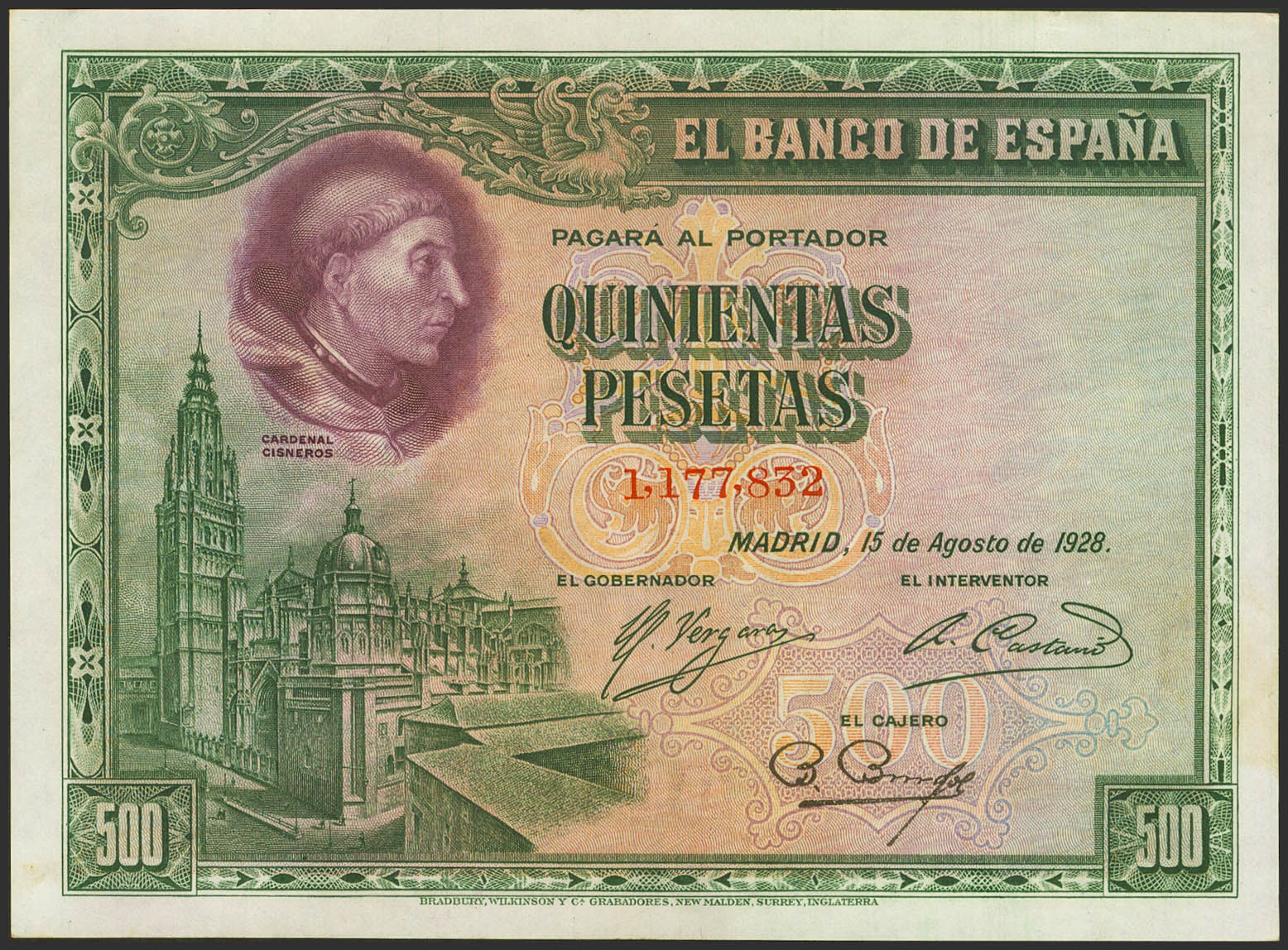 English 500 Pesetas. August 15, 1928. No series. (Edifil 2021: 356, Pick: 77a). It retains all its original finish. Almost Uncirculated-.
