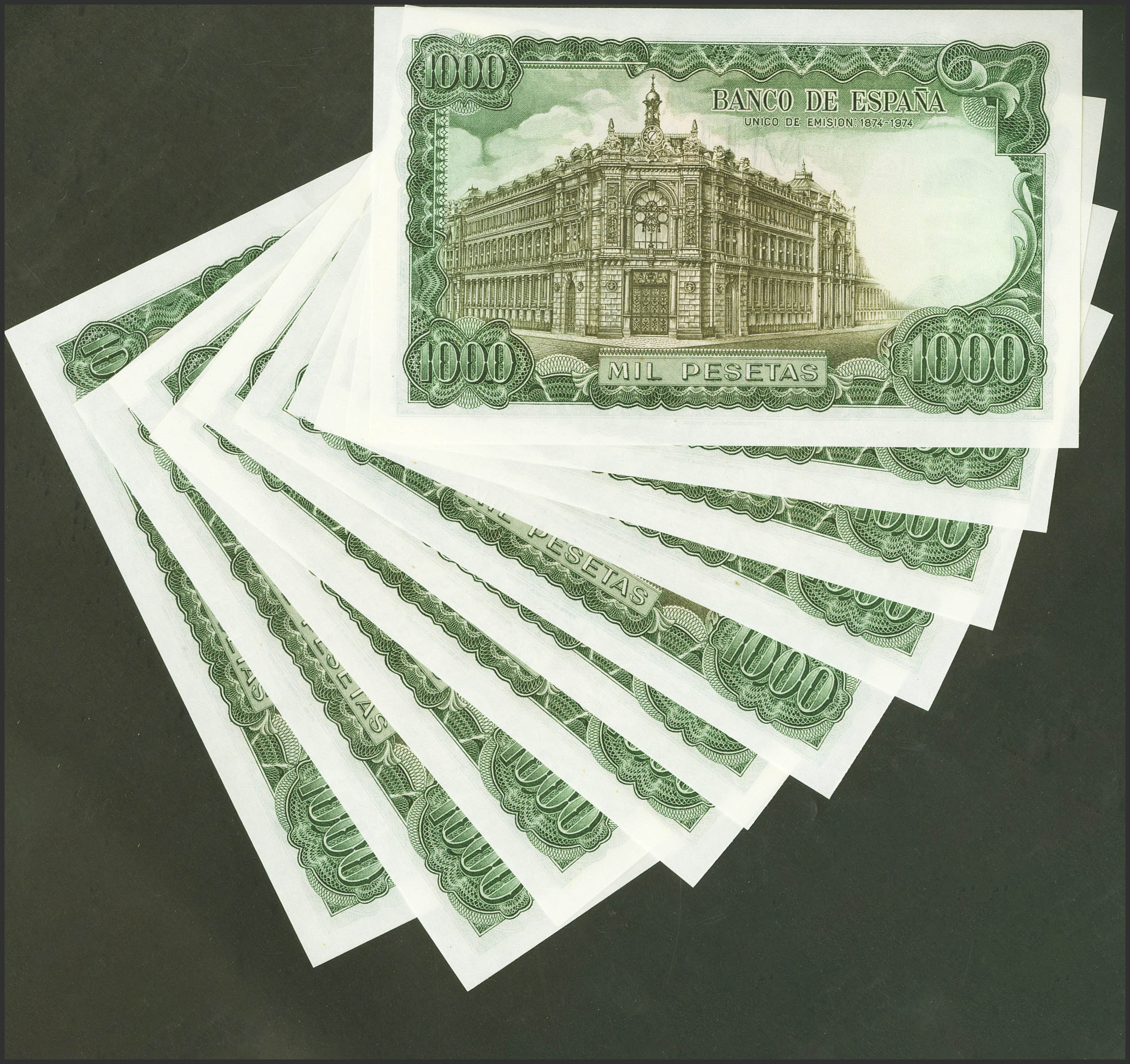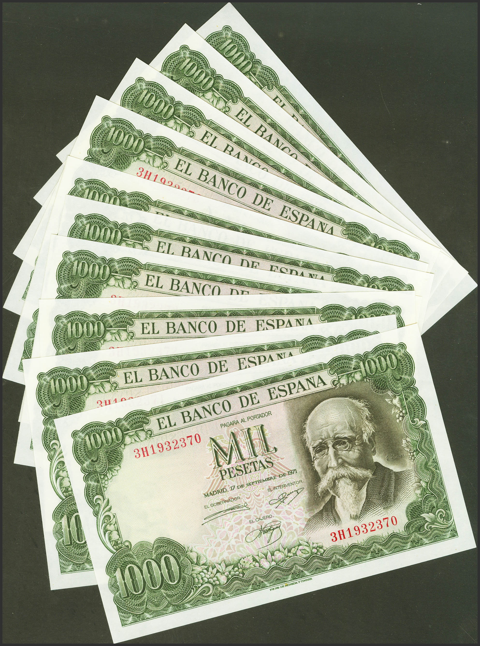 Set of 10 correlative 1000 Pesetas banknotes issued on September 17, 1971, all of them with series 3H (Edifil 2021: 474c), preserving their original size. Uncirculated.