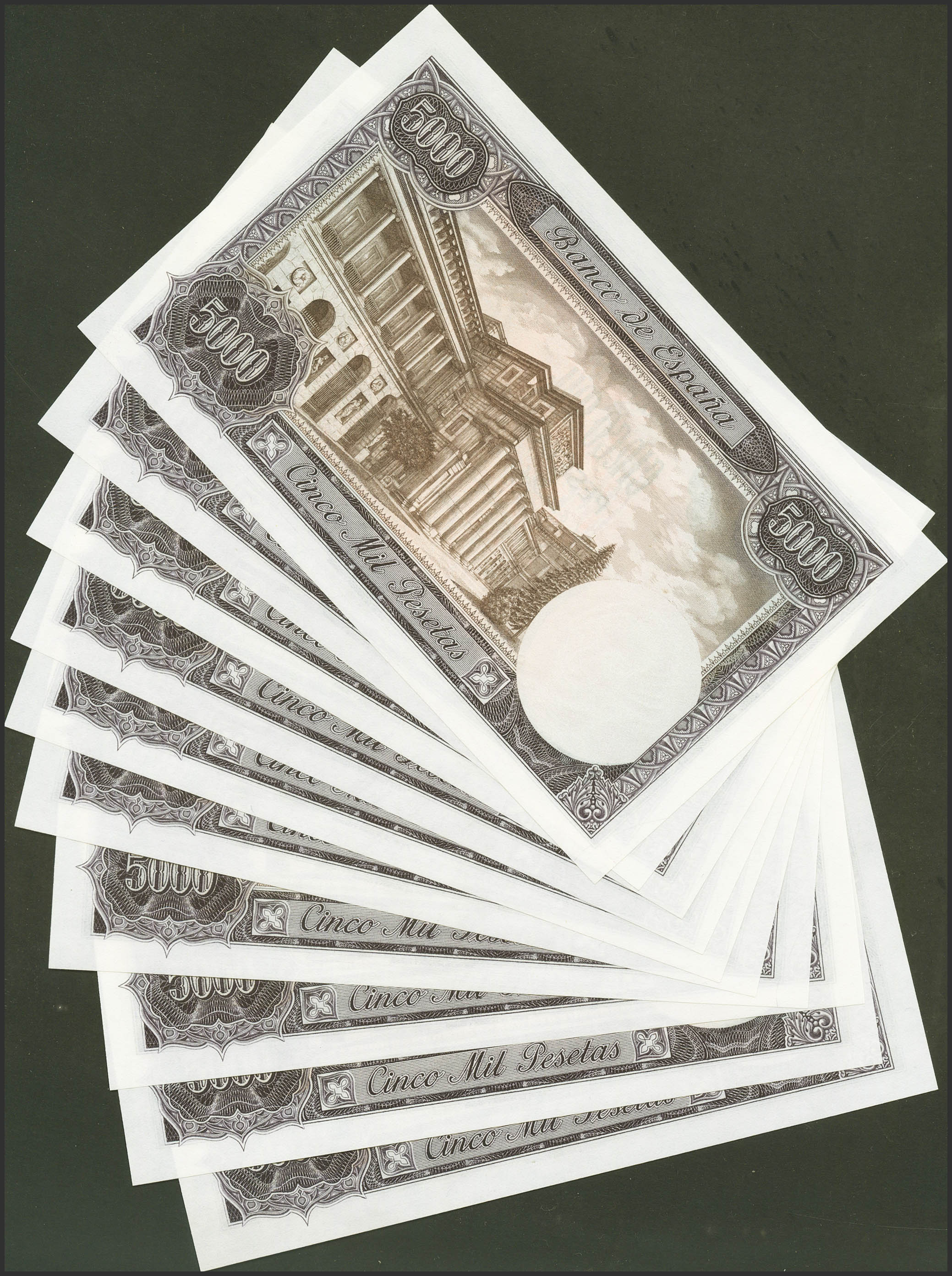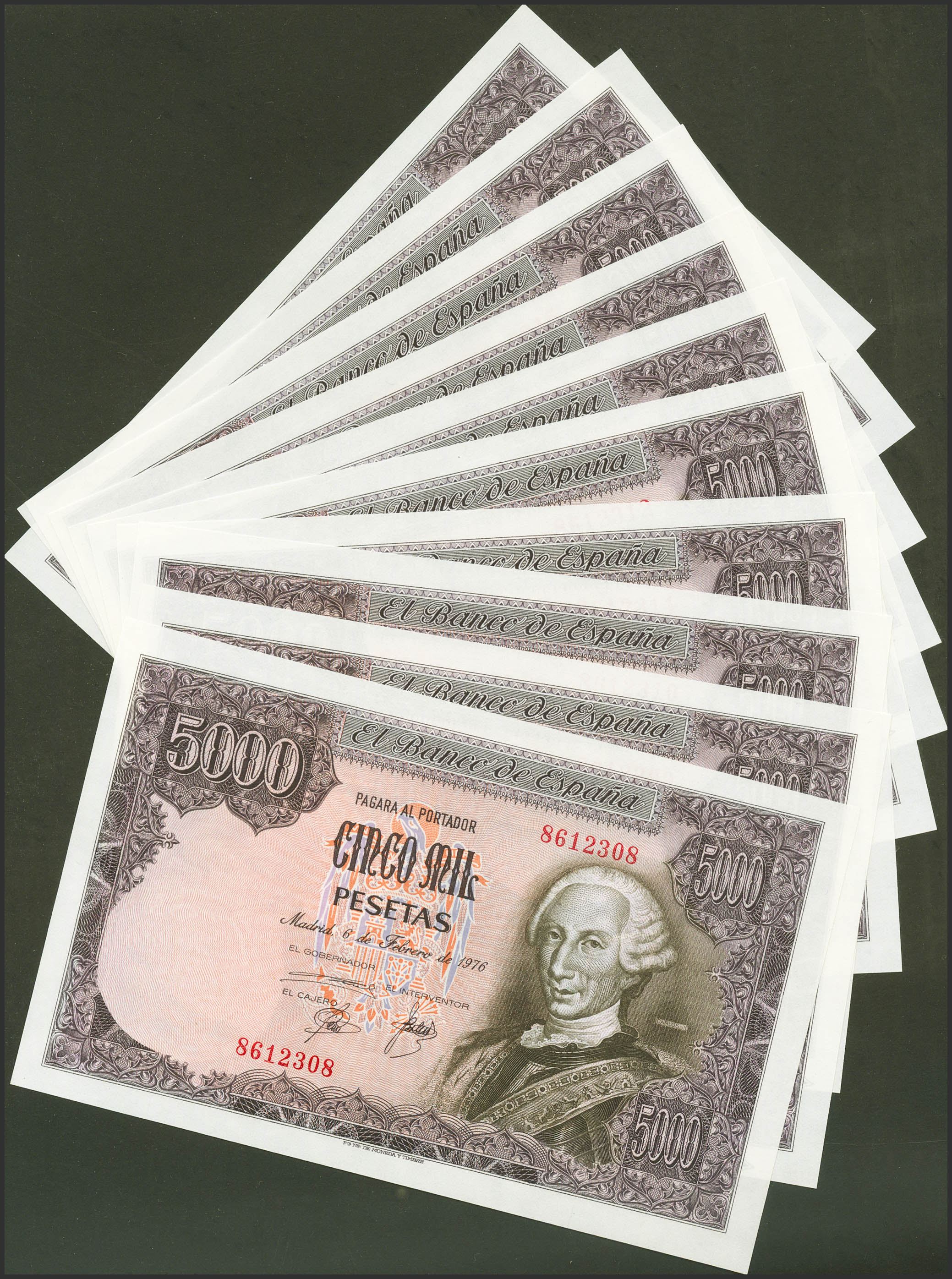 Spectacular set of 10 consecutive 5000 Pesetas banknotes, issued on February 6, 1976, all of them without series. (Edifil 2021: 475). Uncirculated.