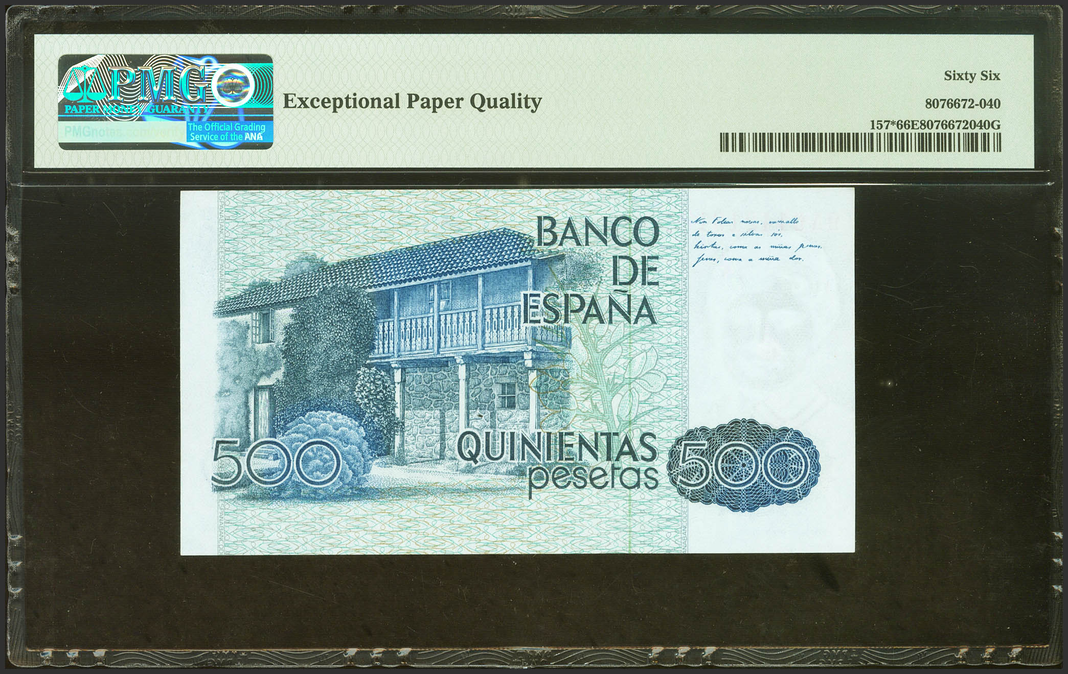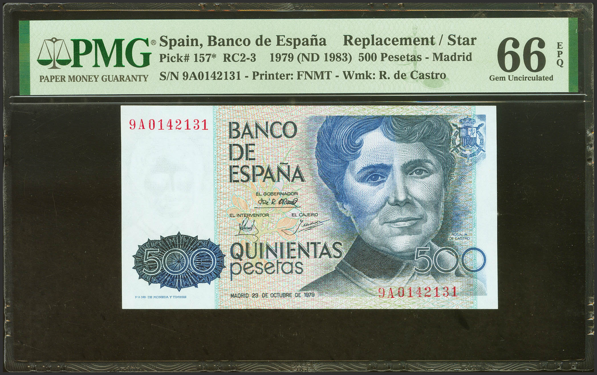 500 Pesetas. October 23, 1979. Special series 9A. (Edifil 2021: 476b, Pick: 157*). Unusual in this exceptional quality. Uncirculated. PMG66EPQ package.