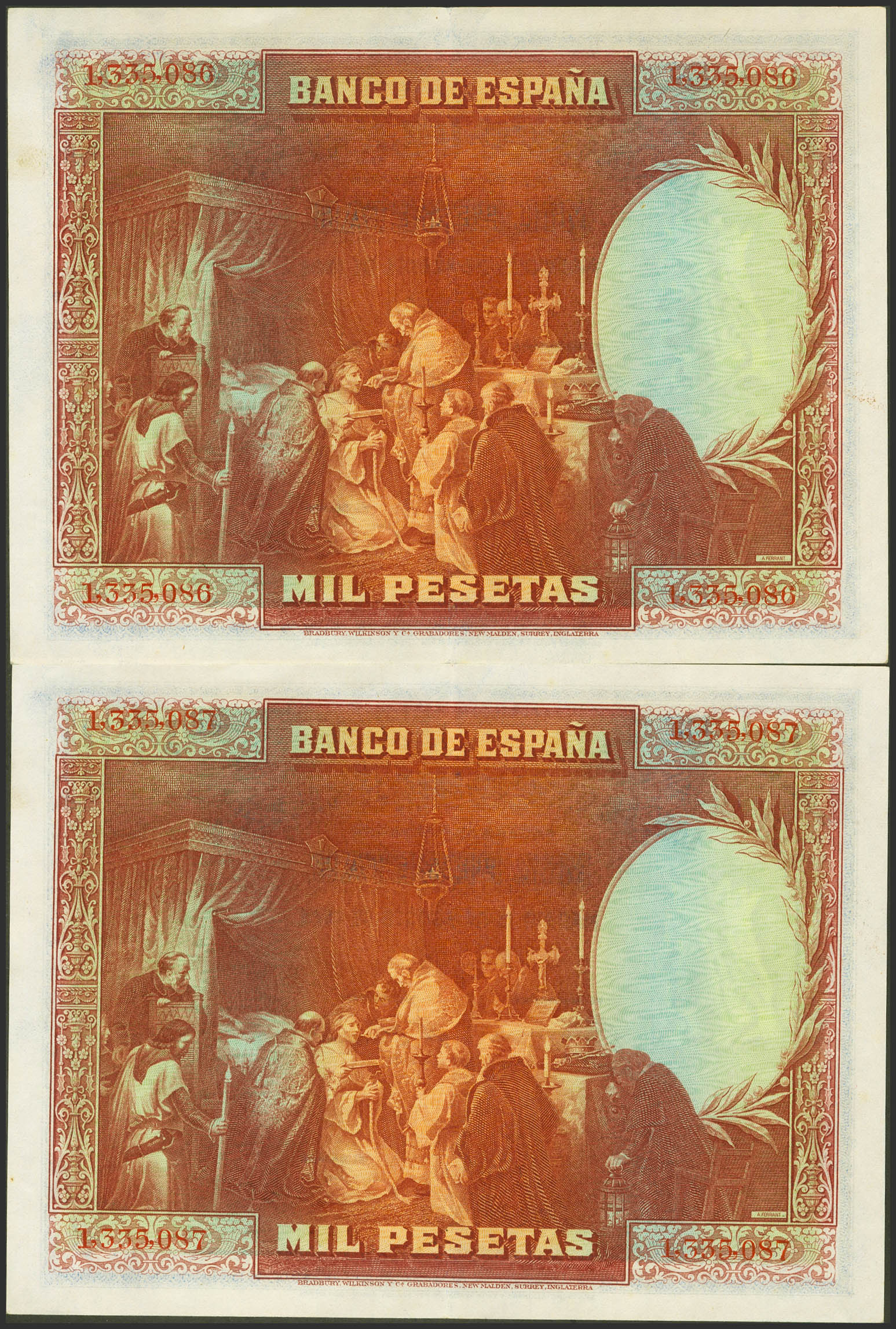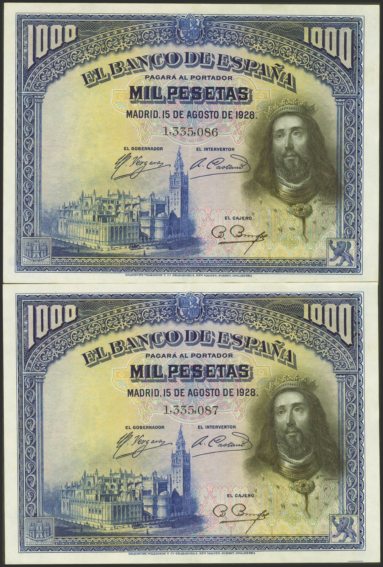 1000 Pesetas. August 15, 1928. Correlative couple. No serie. (Edifil 2021: 357). It retains part of its original finish. Good Extremely Fine.