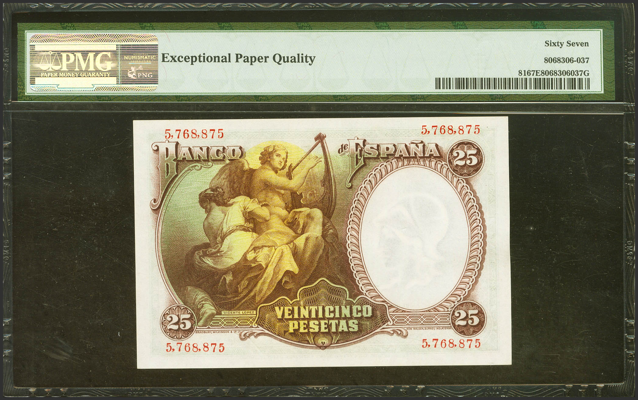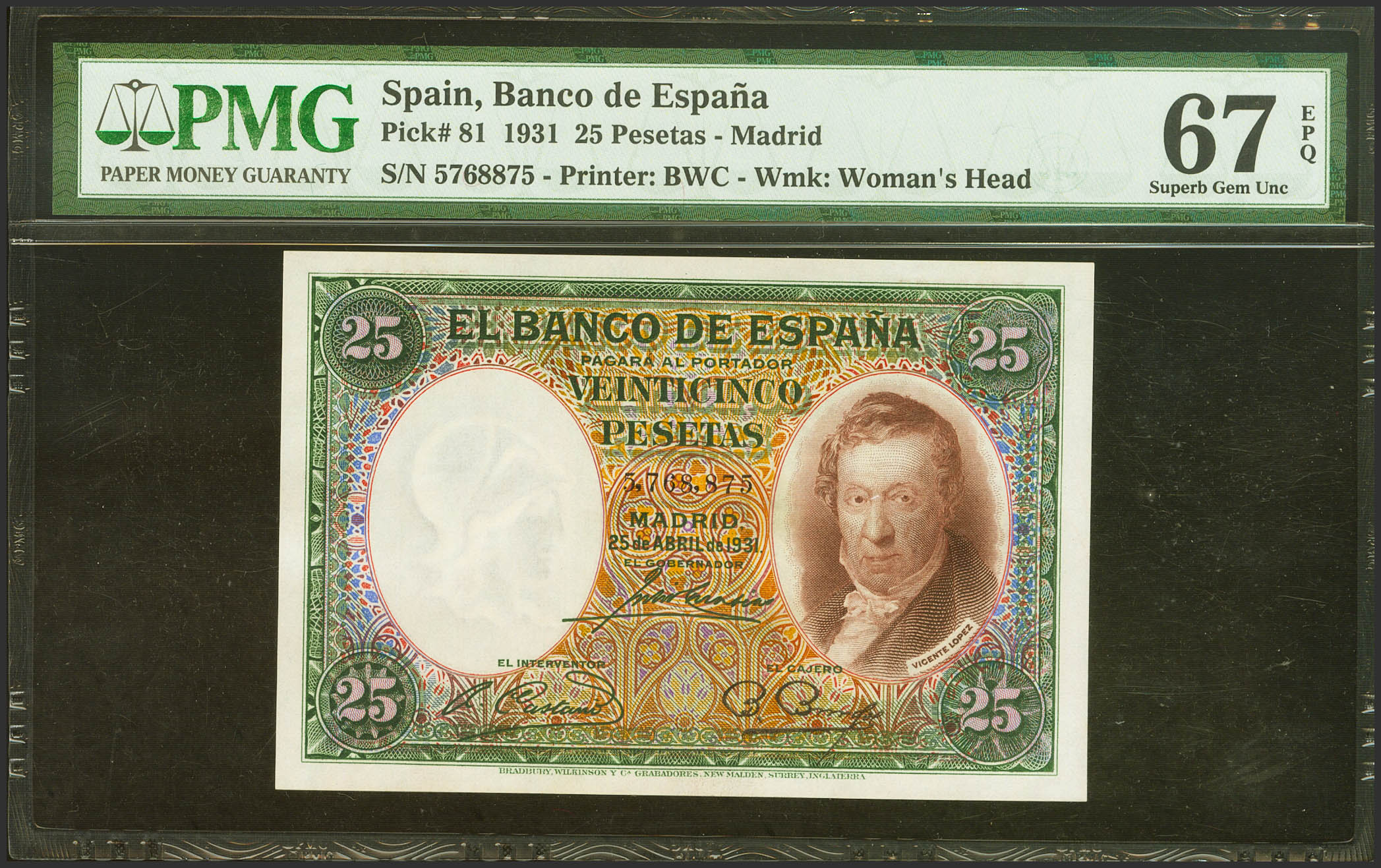 English 25 Pesetas. April 25, 1931. No series. (Edifil 2021: 358, Pick: 81). Very rare in this exceptional quality, original sizing. Uncirculated. PMG67EPQ package.