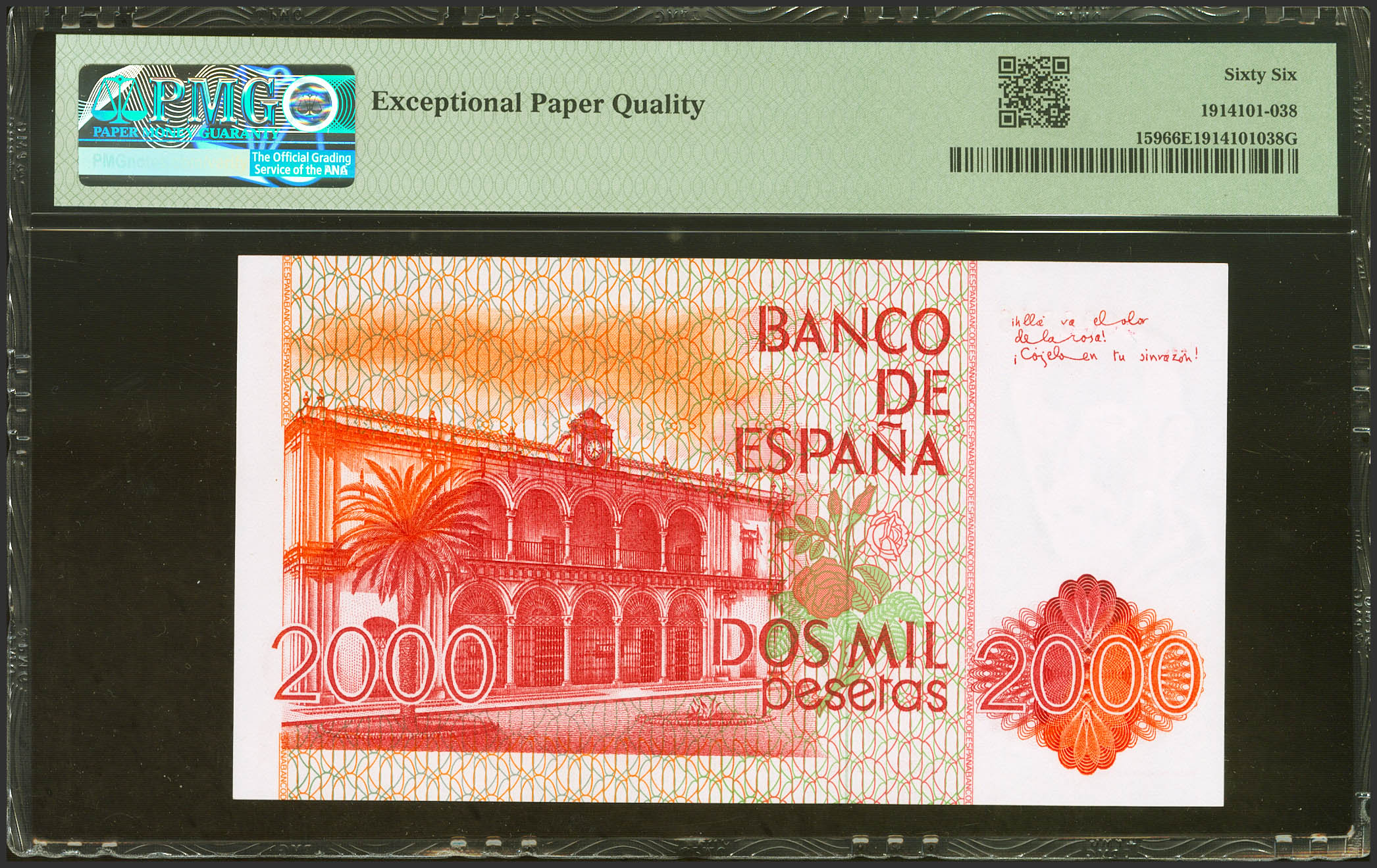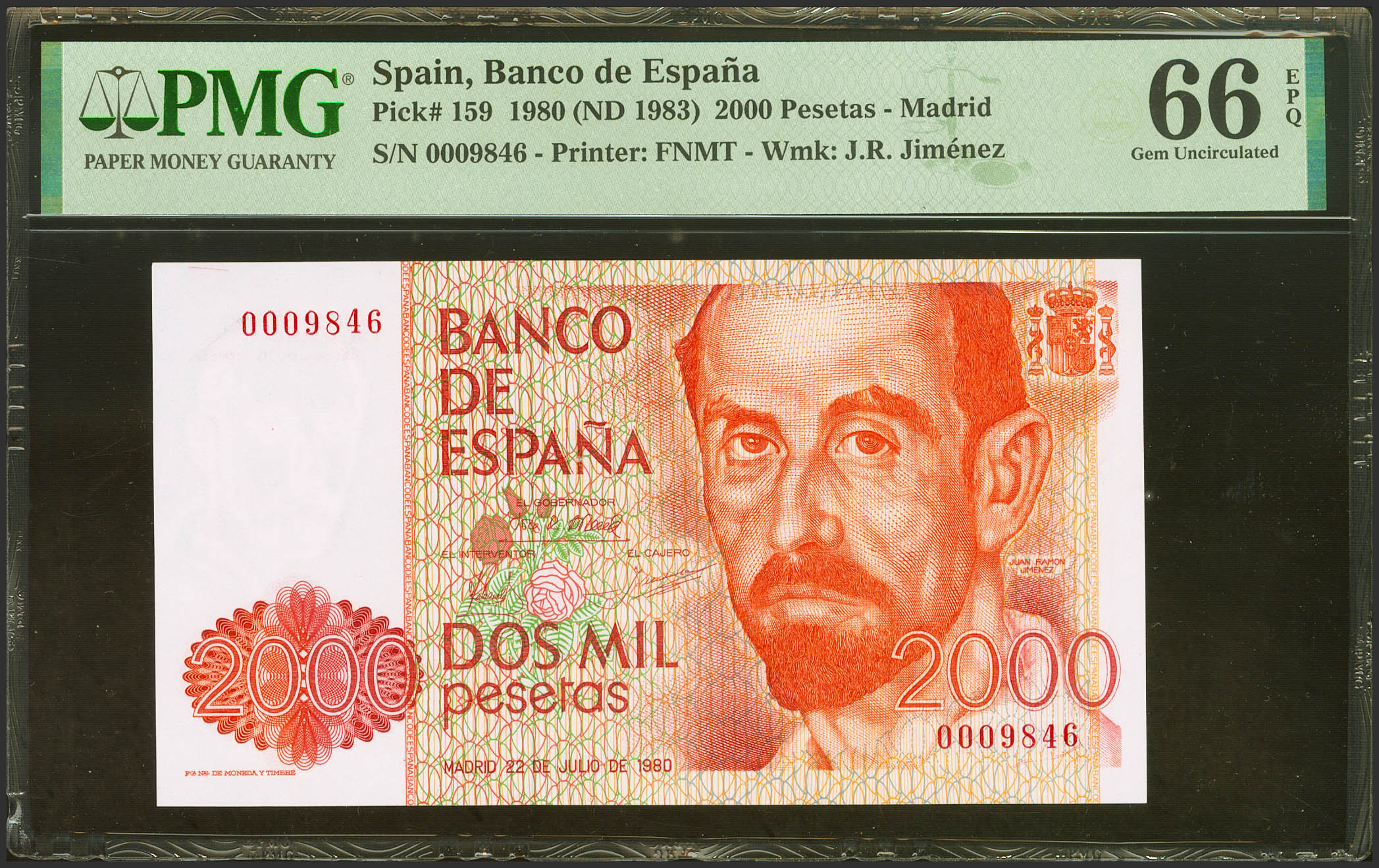 2000 Pesetas. July 22, 1980. Without series and very low numbering. (Edifil 2021: 479, Pick: 159). Unusual in this exceptional quality. Uncirculated. PMG66EPQ package.